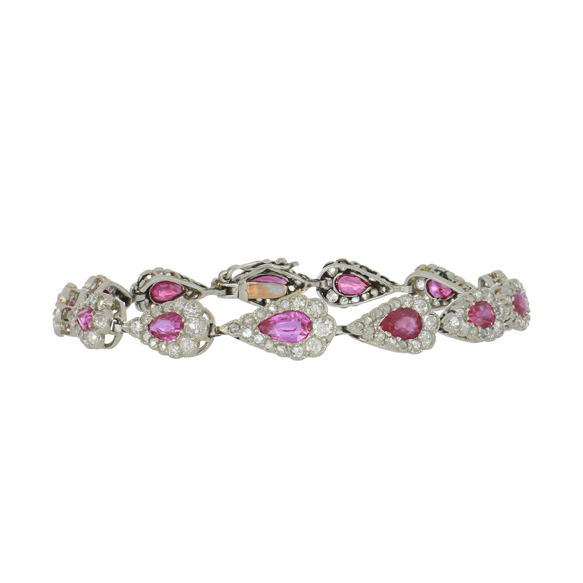 An Edwardian pear-shape and marquise ruby bracelet, featuring graduated old European and rose-cut diamond halos, set in platinum. Circa 1910.