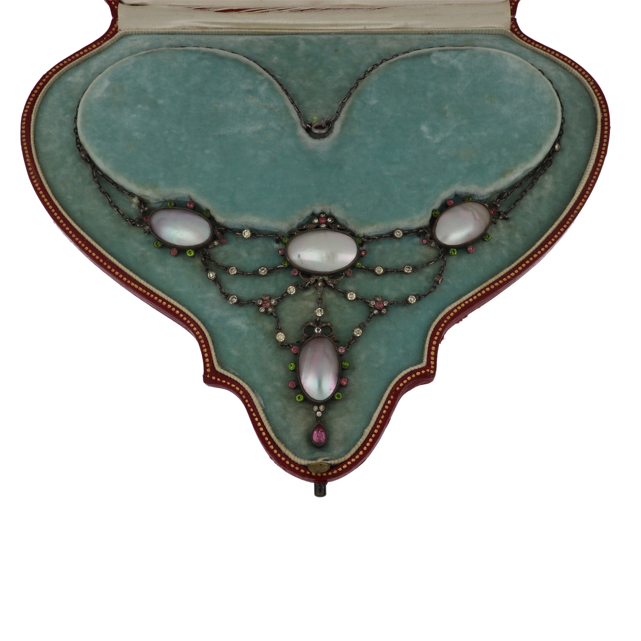 An Edwardian silver multicolored paste and coque de perle festoon suffragette necklace, with french hallmarks and fitted box, Circa 1900