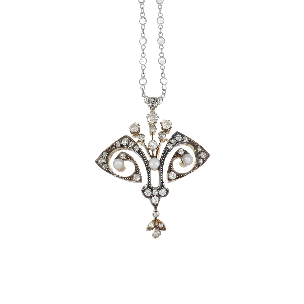 An antique classic Edwardian silver topped 14K rose gold diamond and pearl lavalier. Circa 1900.