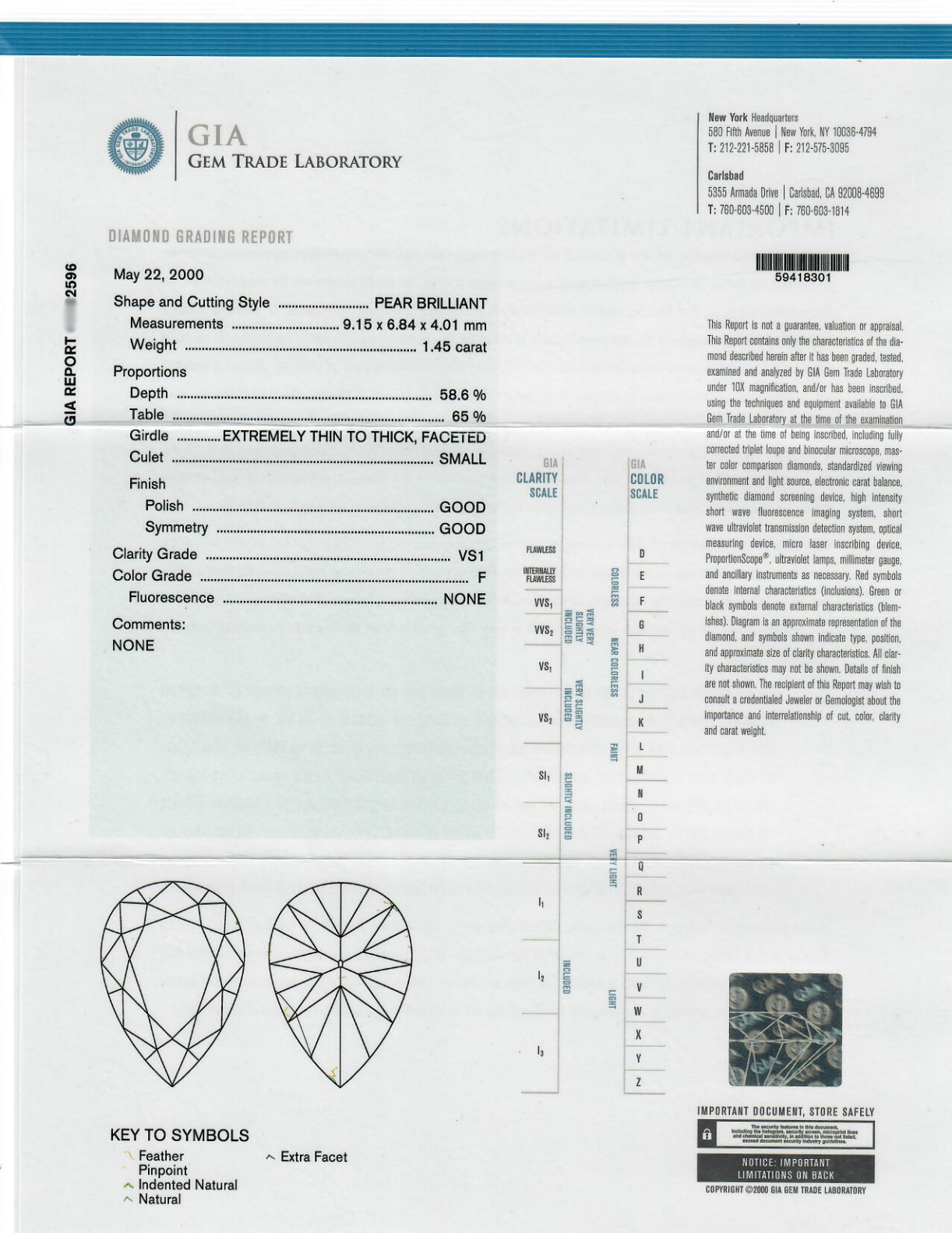 An estate platinum pear shape diamond engagement ring with trillion side stones. Circa 2000.