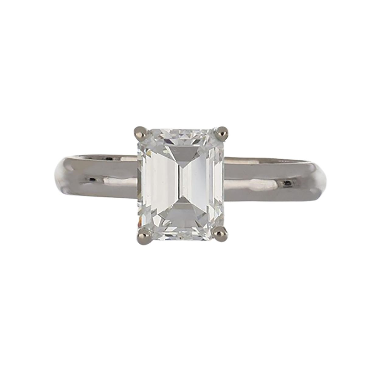 An estate vintage solitaire emerald-cut diamond engagement ring set in 14k white gold. Circa 2000.