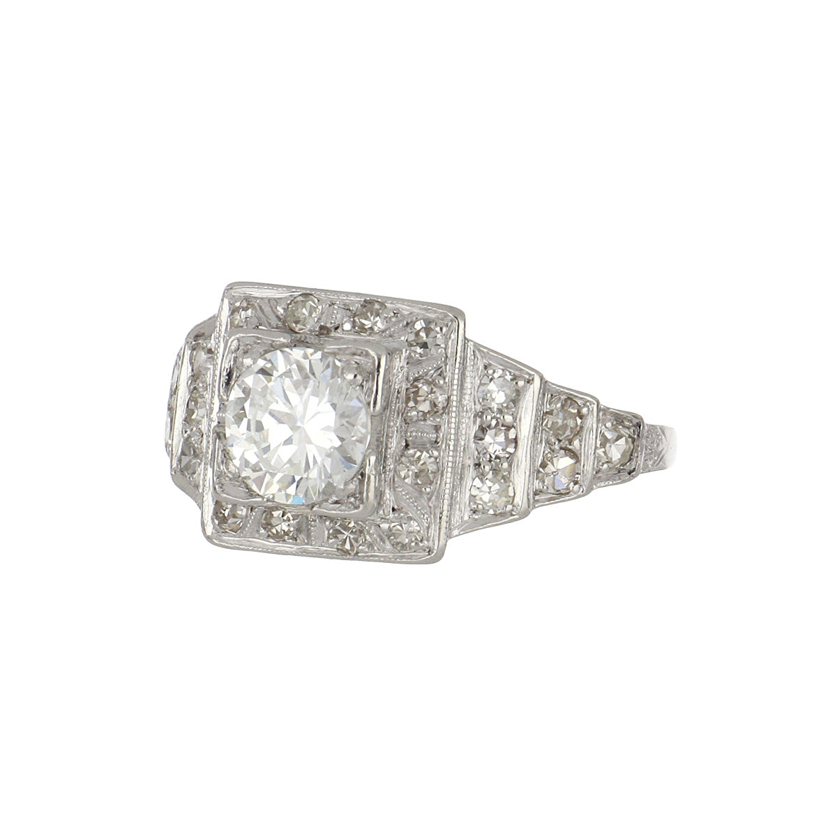 An Art-Deco illusion-set platinum diamond ring with stepped shoulders. Circa 1920.