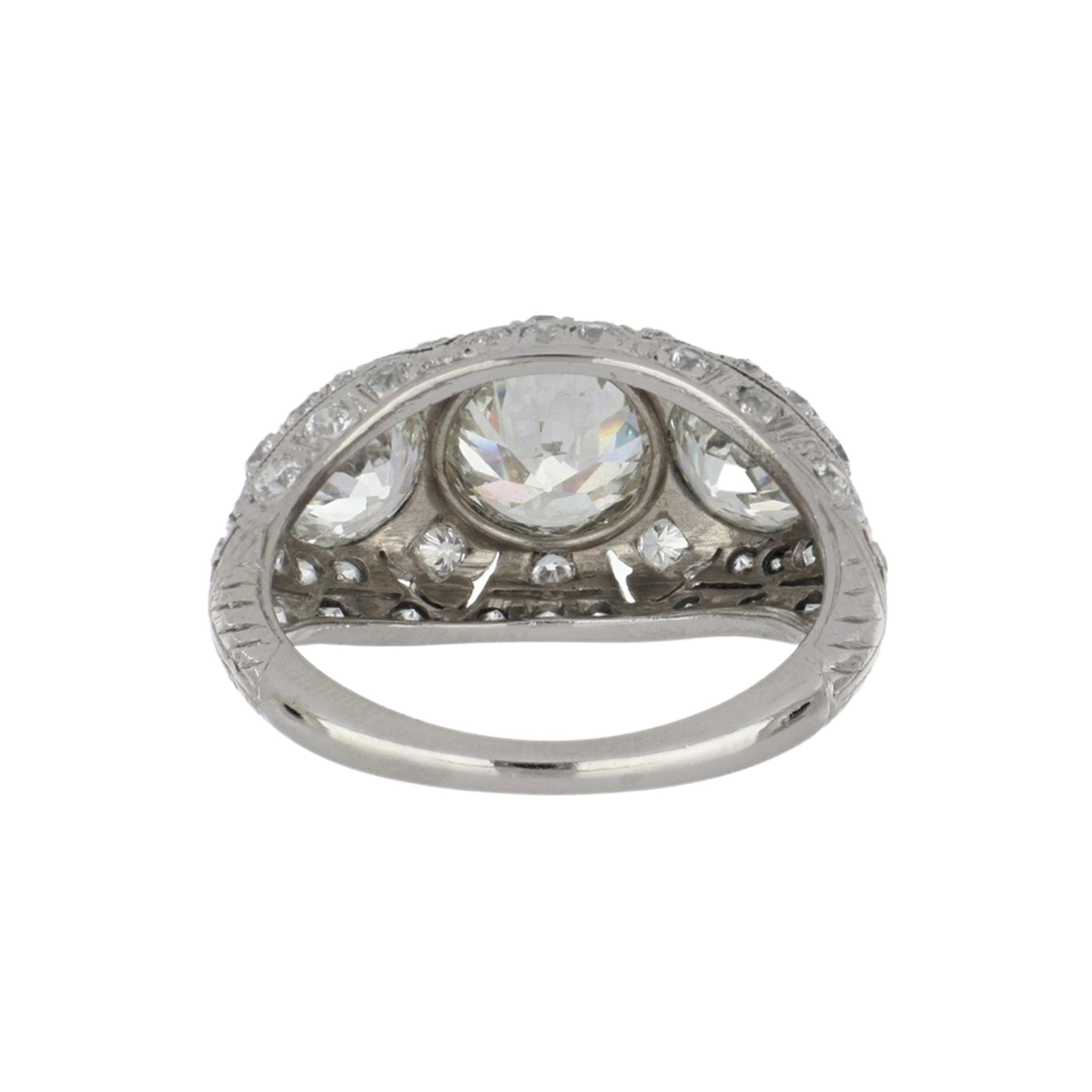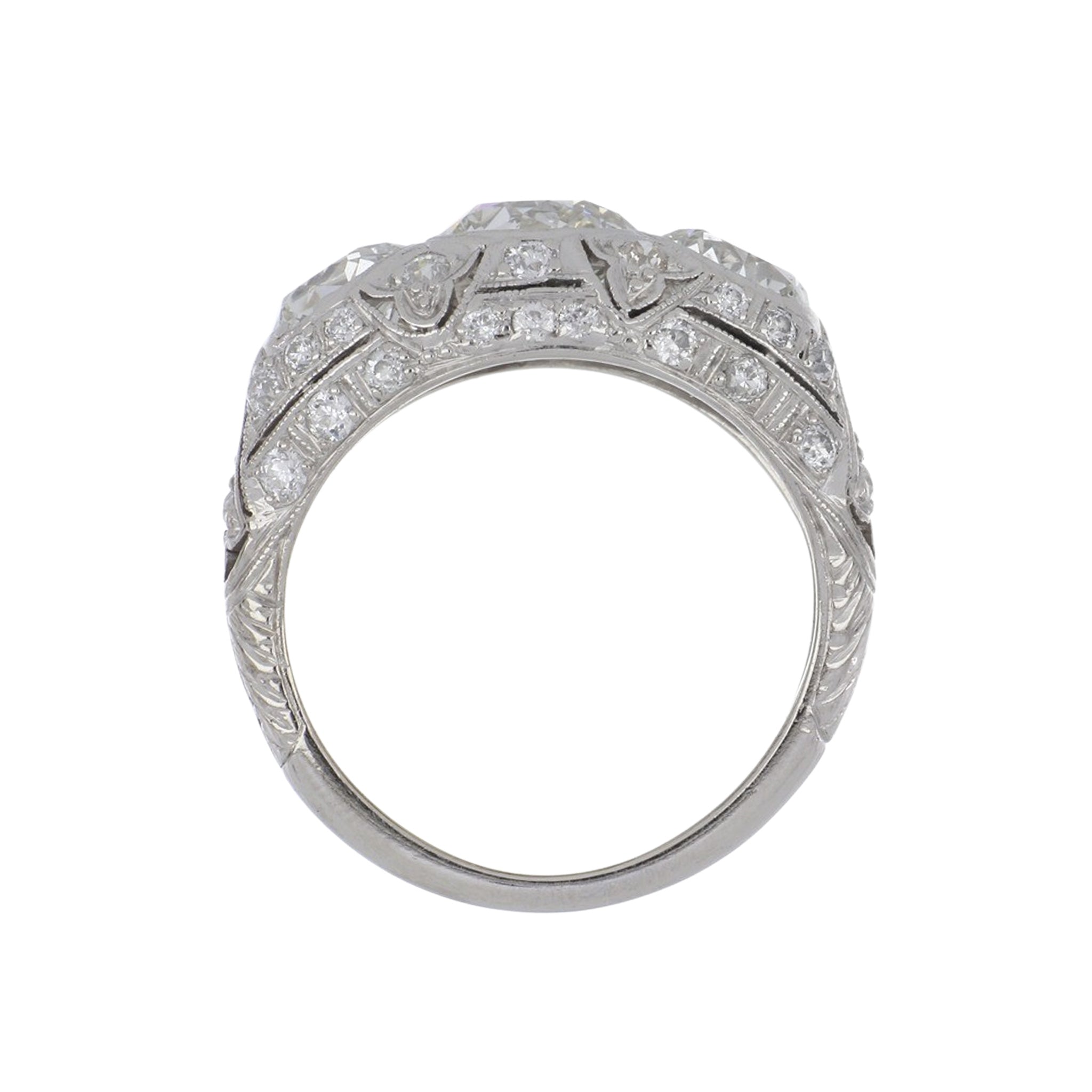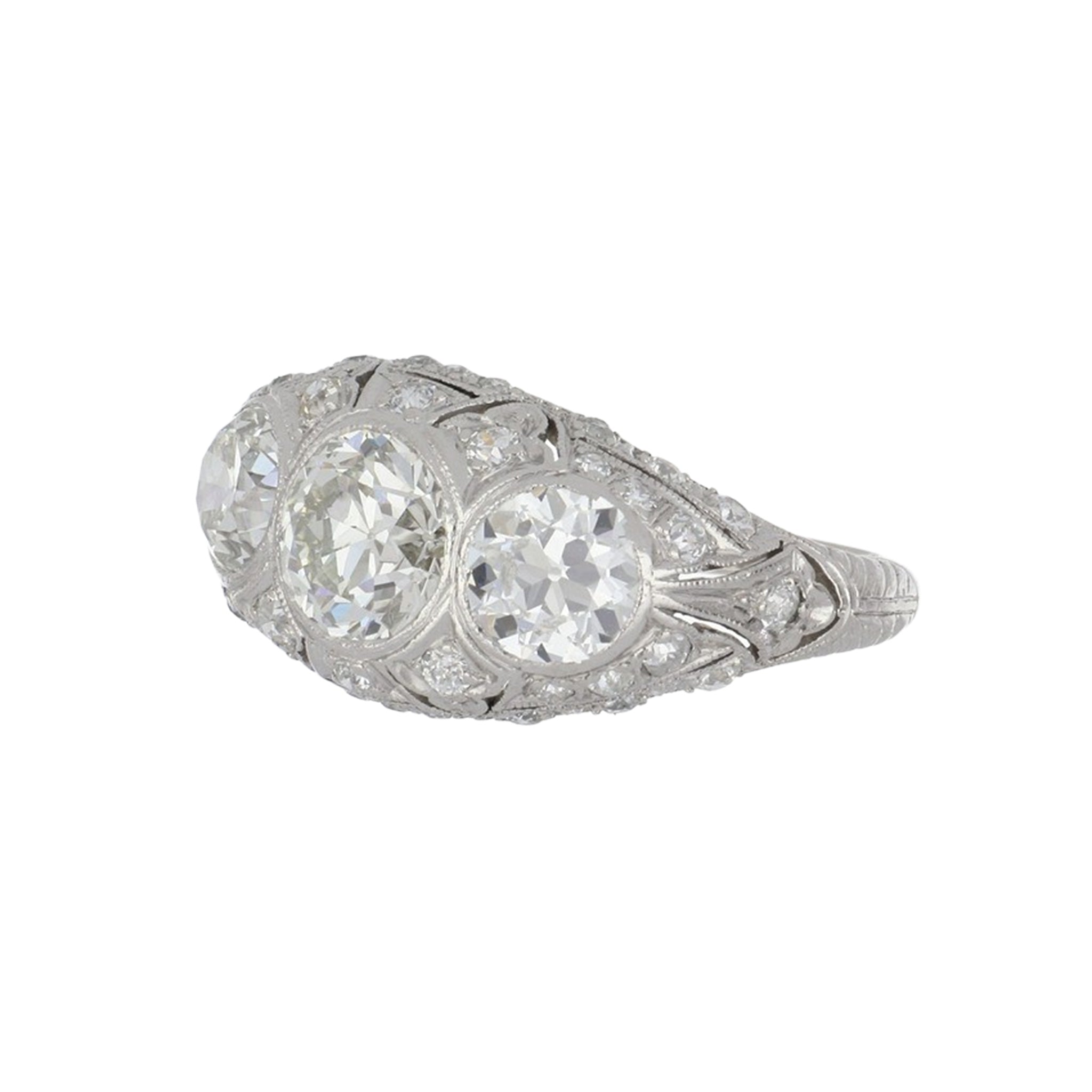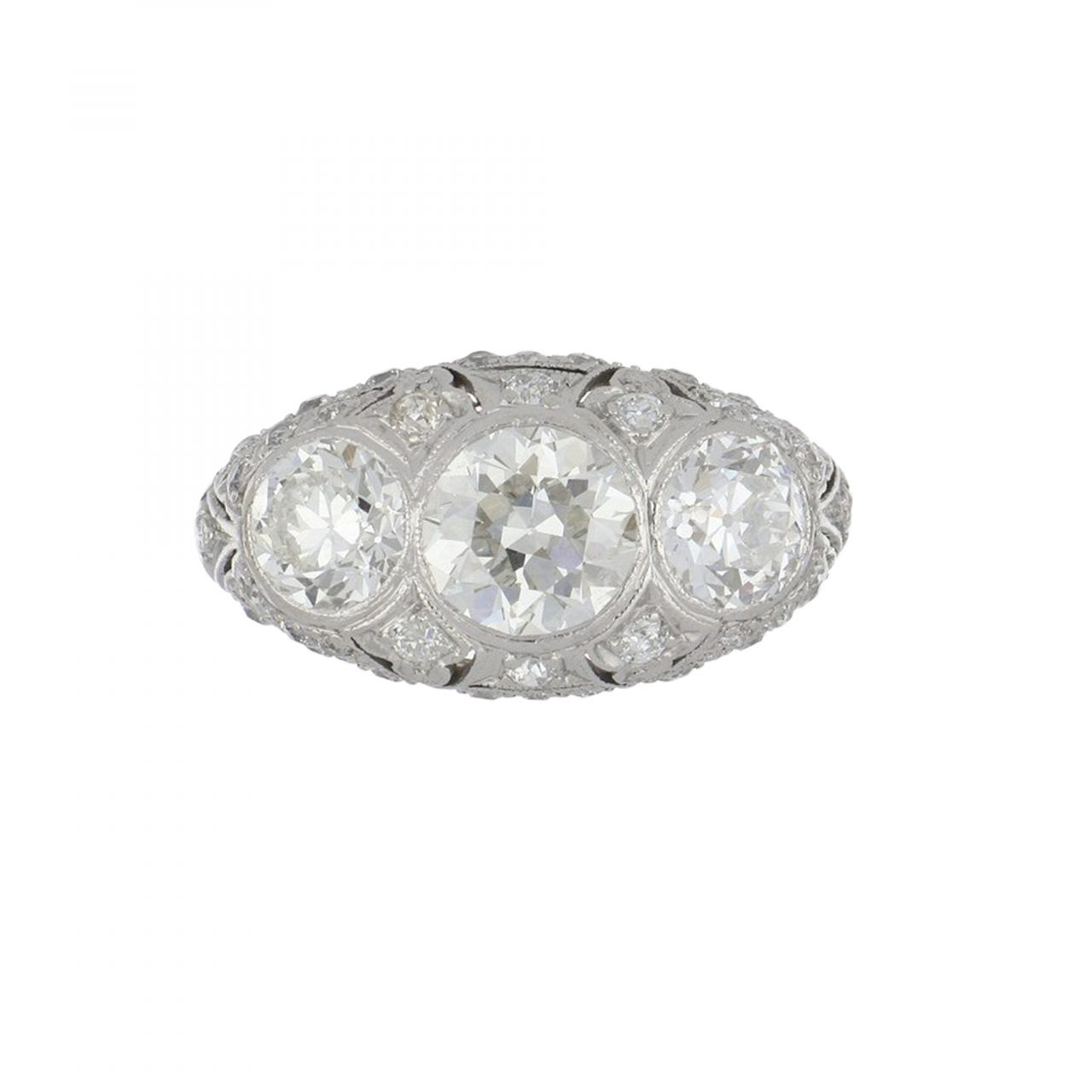 An estate important Art-Deco three stone diamond ring with openwork, engraving and mill-grain details set in platinum. Circa 1920.