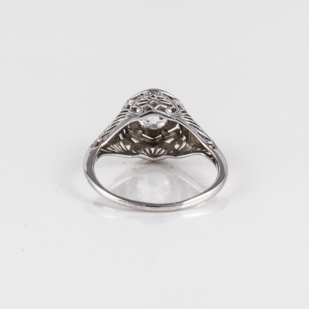 An Art-Deco filigree engagement ring featuring an Old European-cut diamond, set in 18K white gold. Circa 1920.