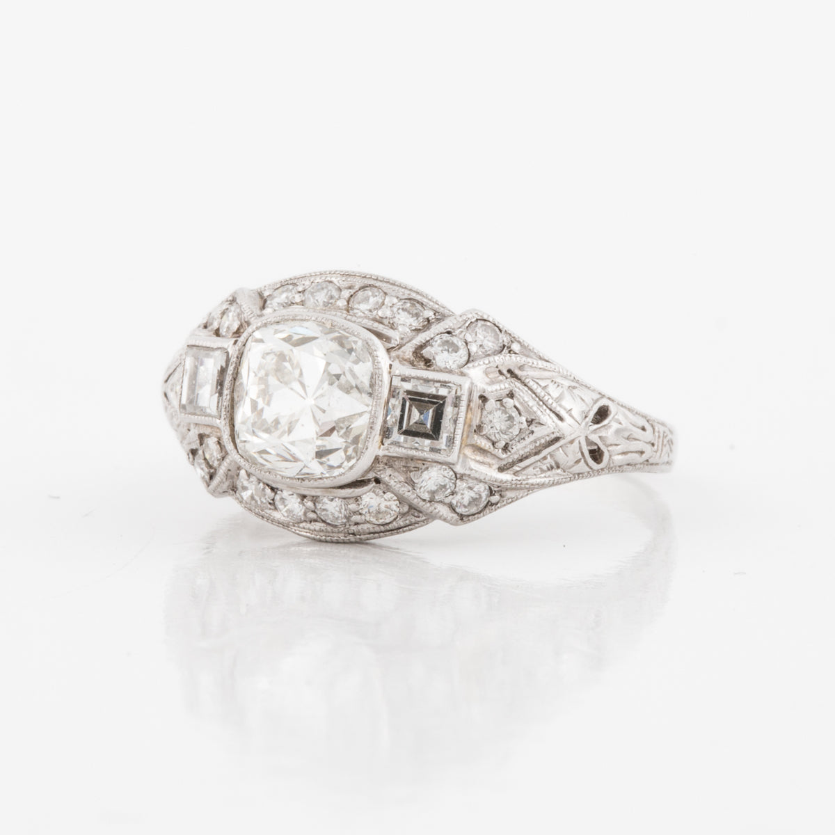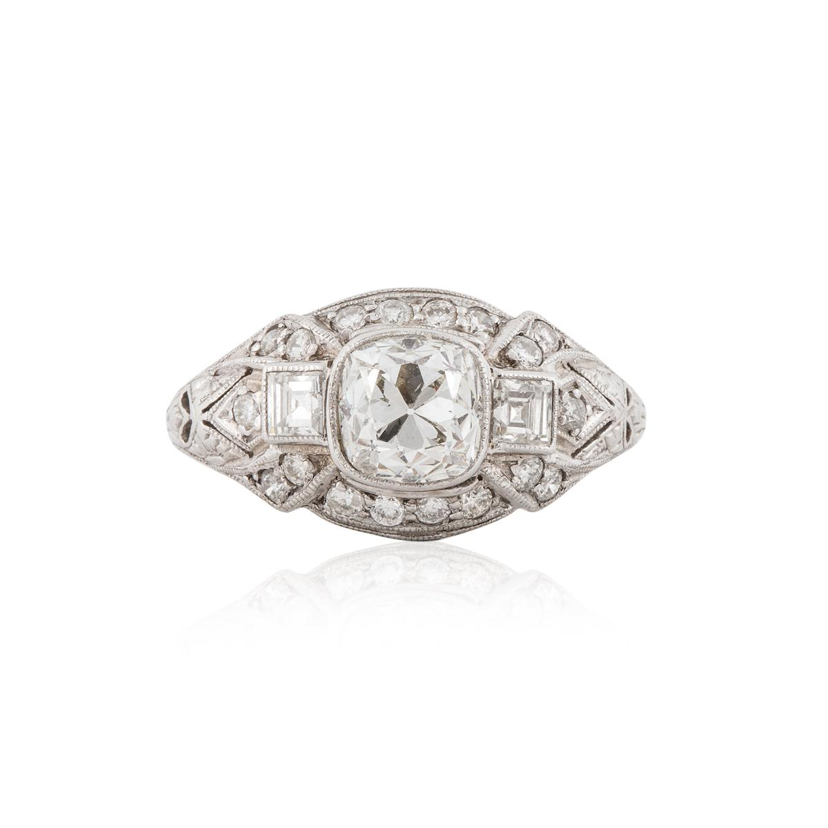 An Art-Deco platinum cushion-cut diamond ring. Circa 1920.