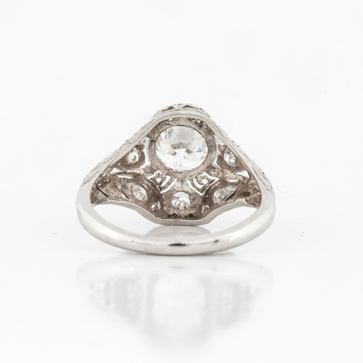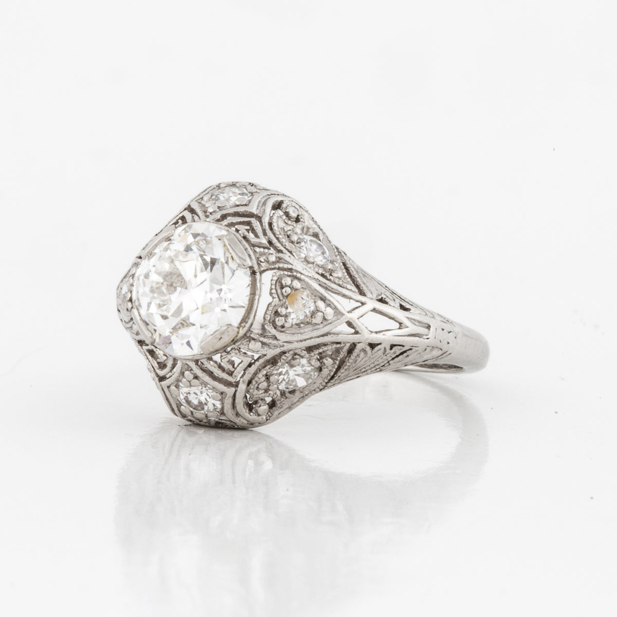 An Art Deco platinum filigree diamond engagement ring, with diamond accents. Circa 1920.
