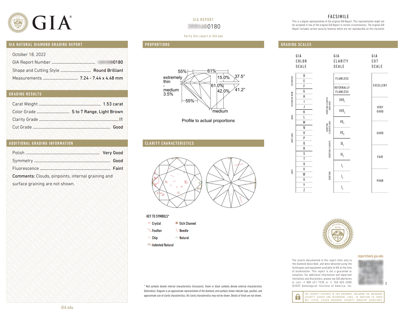 GIA: 2221680180 / S-T range (Light Brown), I1 clarity