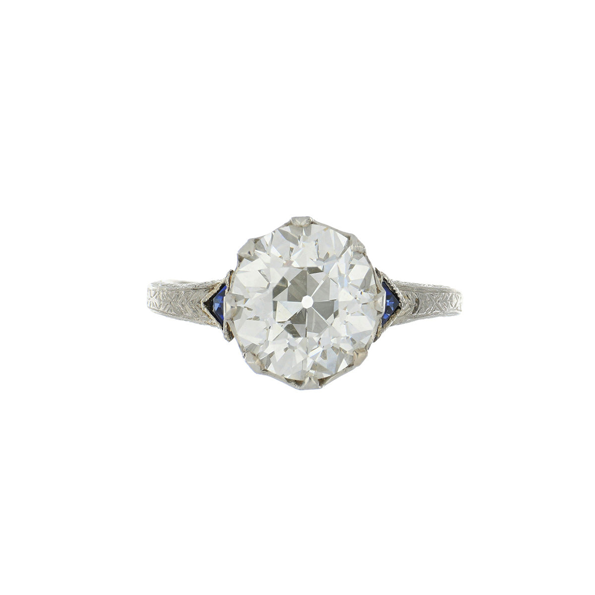 An Art-Deco old European-cut diamond and synthetic sapphire three stone ring in platinum with chenier and engraving. Circa 1920.