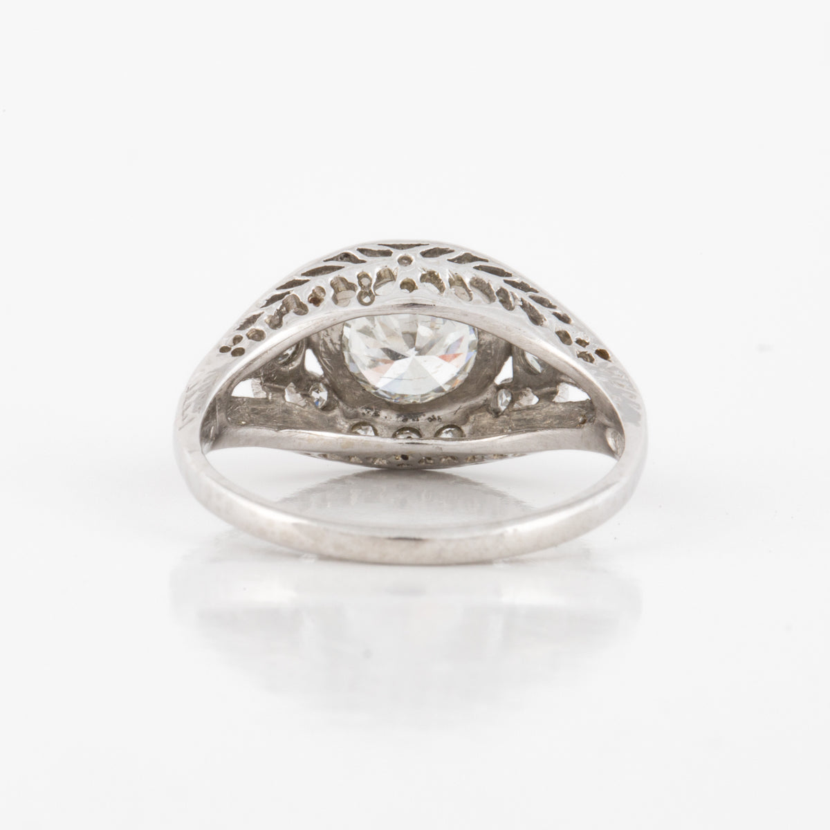 An Art-Deco Old Mine-cut diamond engagement ring with accent round-cut diamonds, set in platinum. Circa 1930.