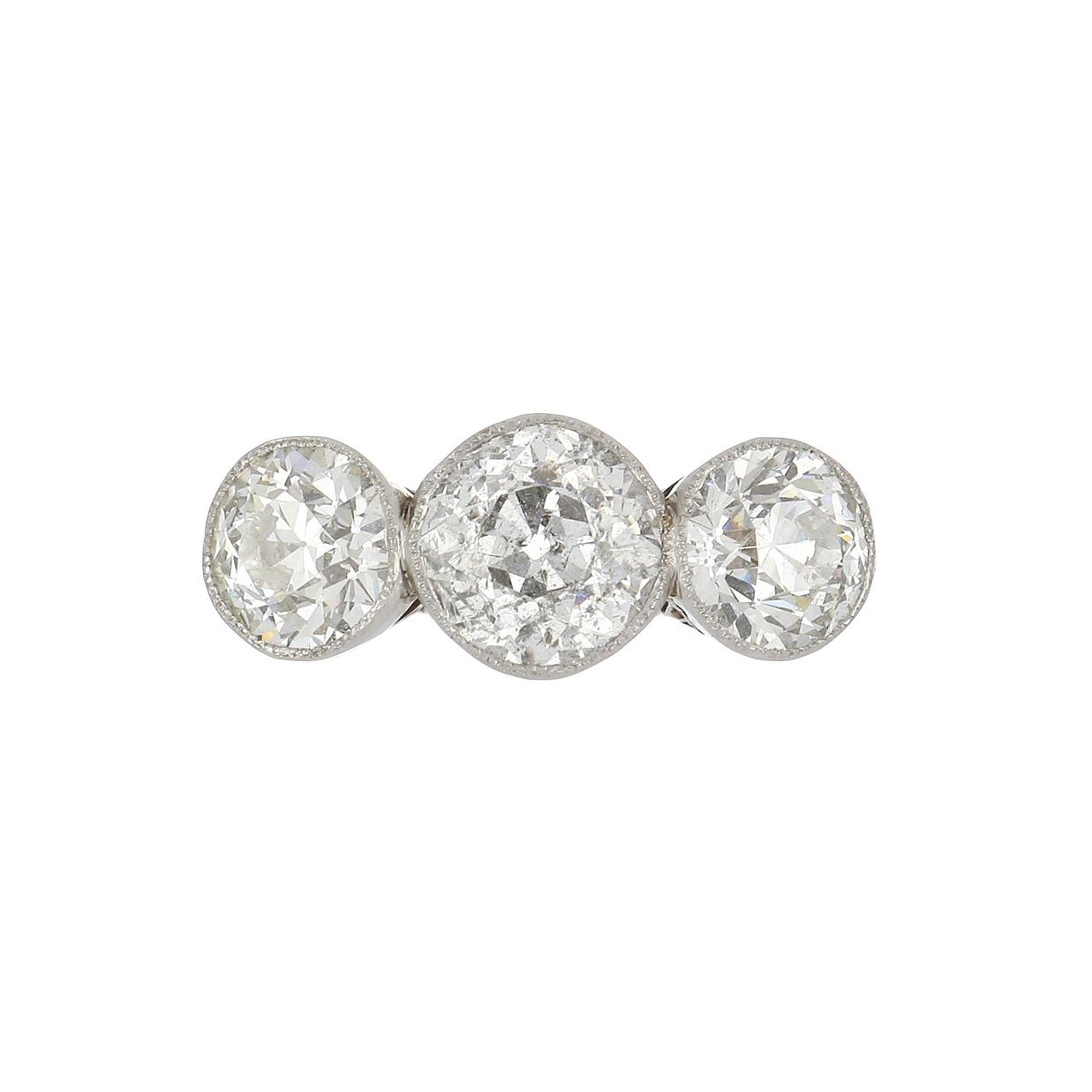 An Edwardian bezel-set three stone diamond ring with openwork and gored shank in platinum. Circa 1910.