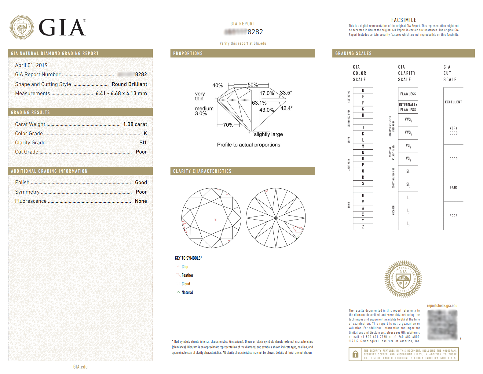 1 Round brilliant-cut diamond=1.08 carats, K color, SI1 clarity