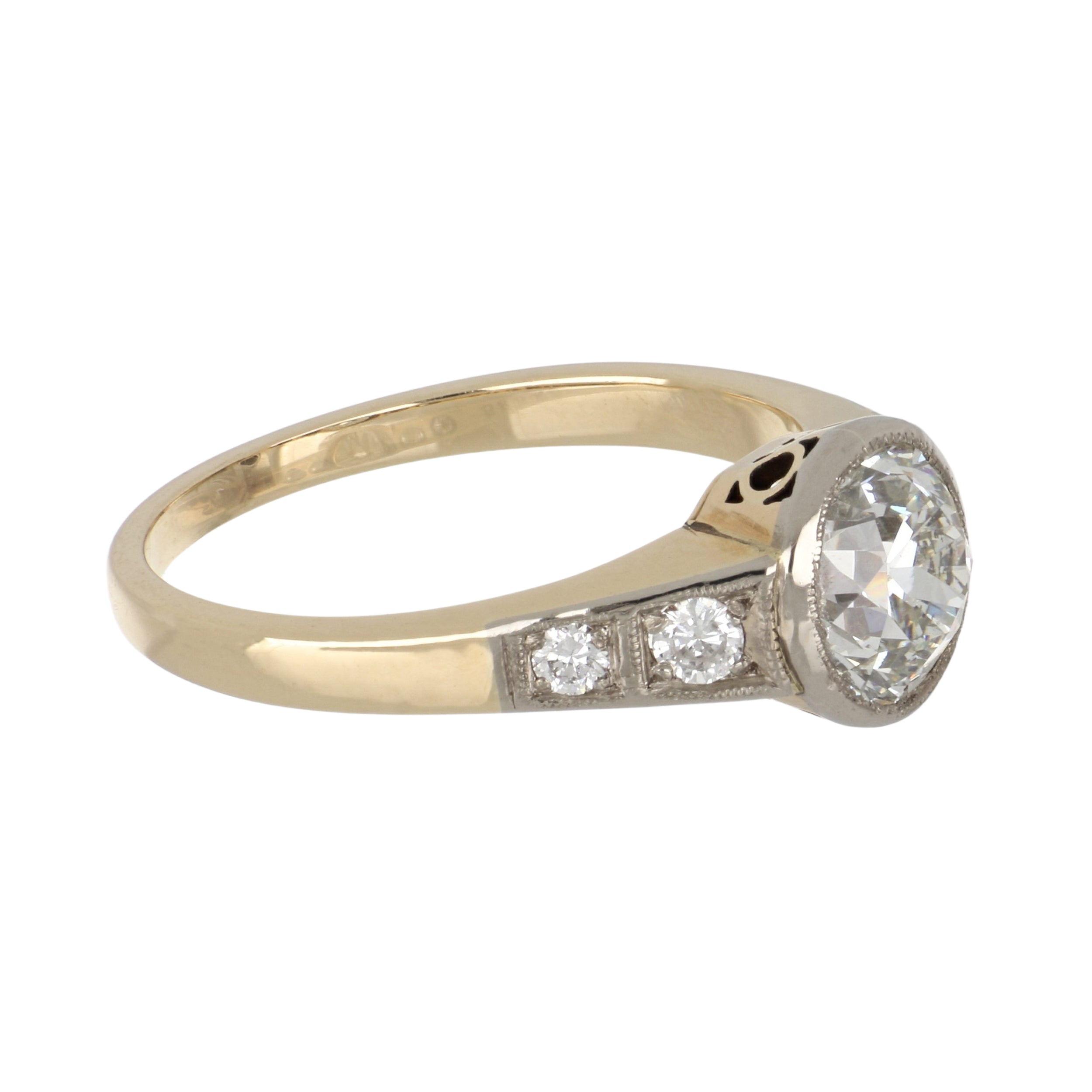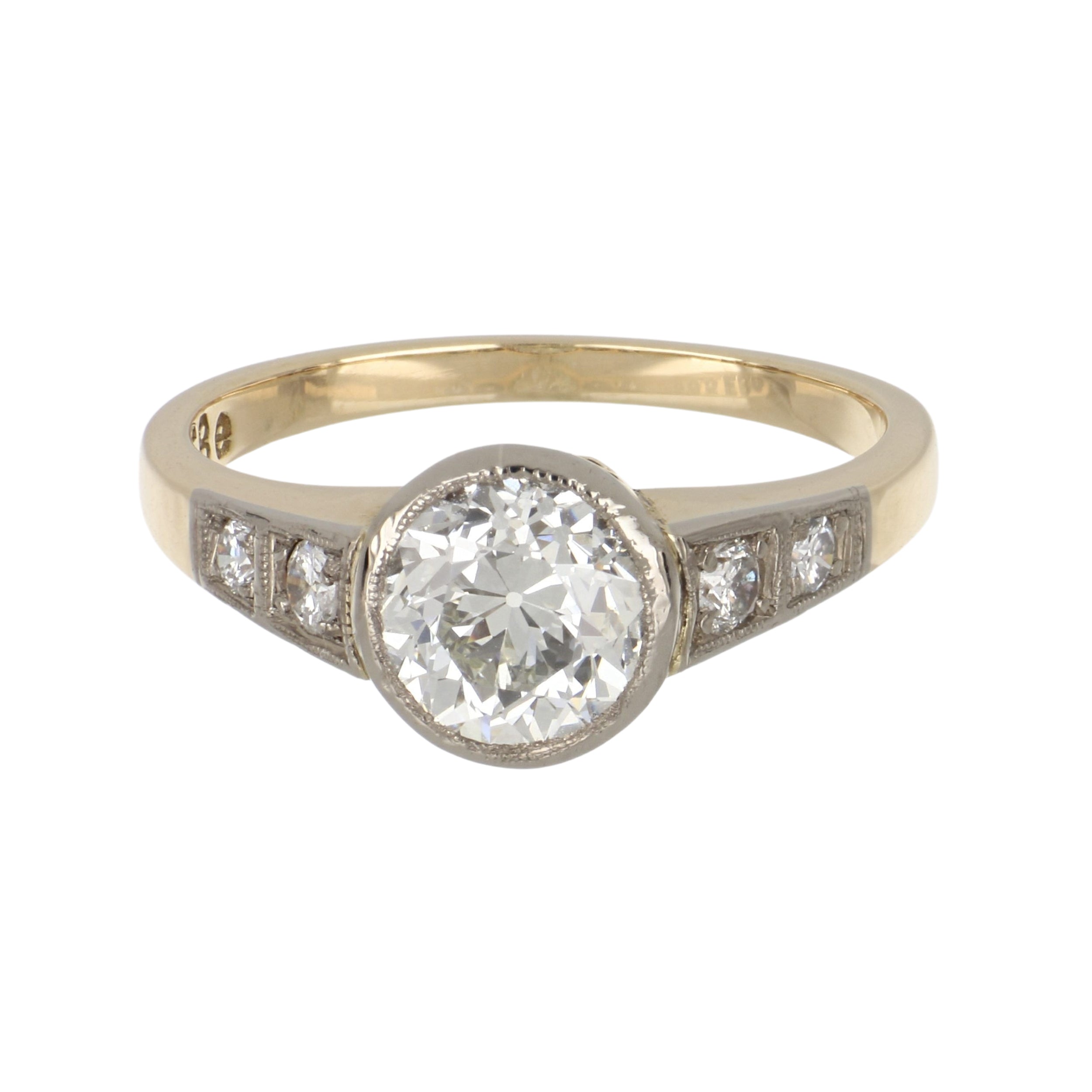 An Edwardian gypsy-set Old European-cut diamond ring with millegrain and openwork and plaque-set diamond shoulders, set with platinum topped 14K yellow gold. Circa 1910.