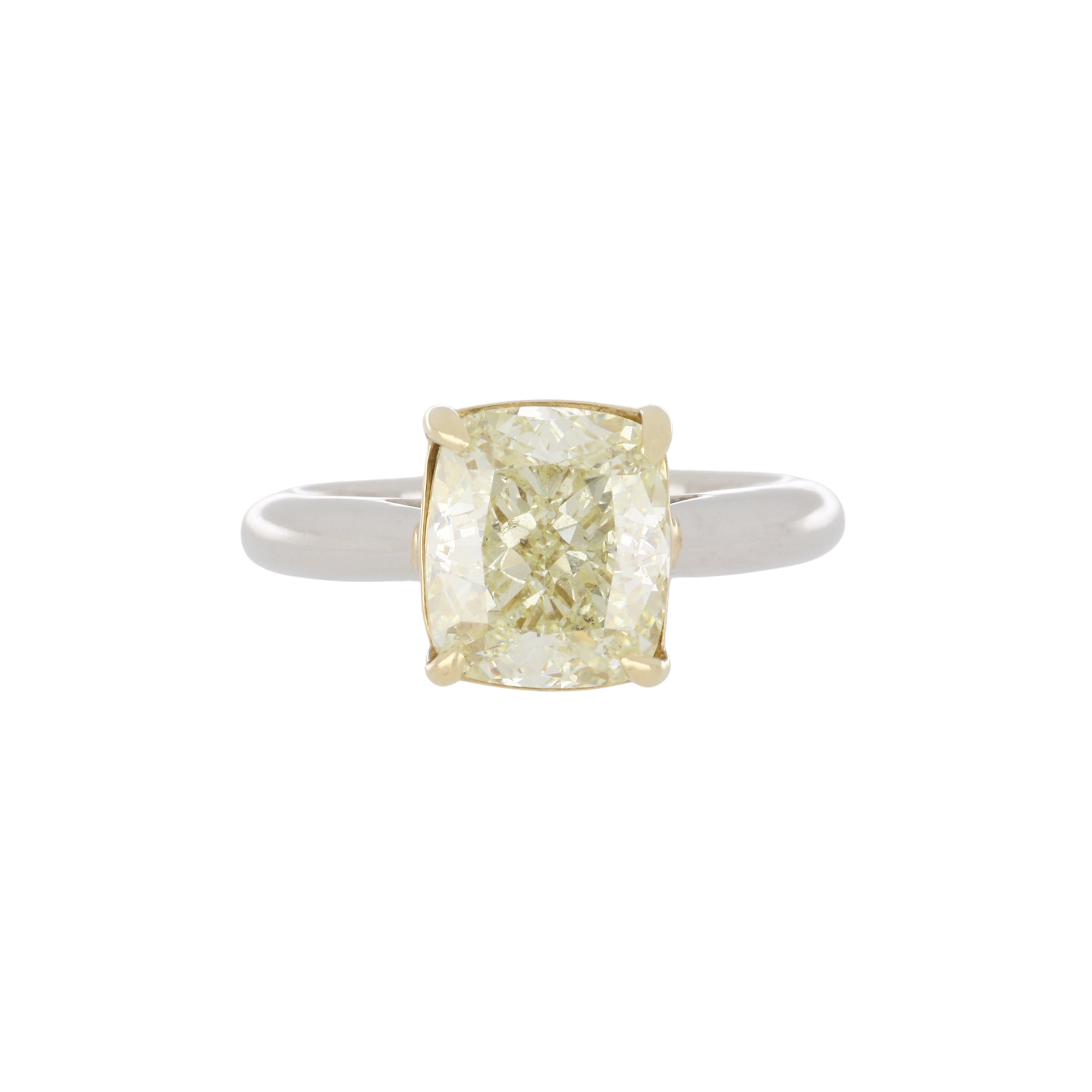 An estate solitaire, prong-set, cushion-cut diamond engagement ring, set in a platinum mounting and 18K yellow gold head. Circa 2010.