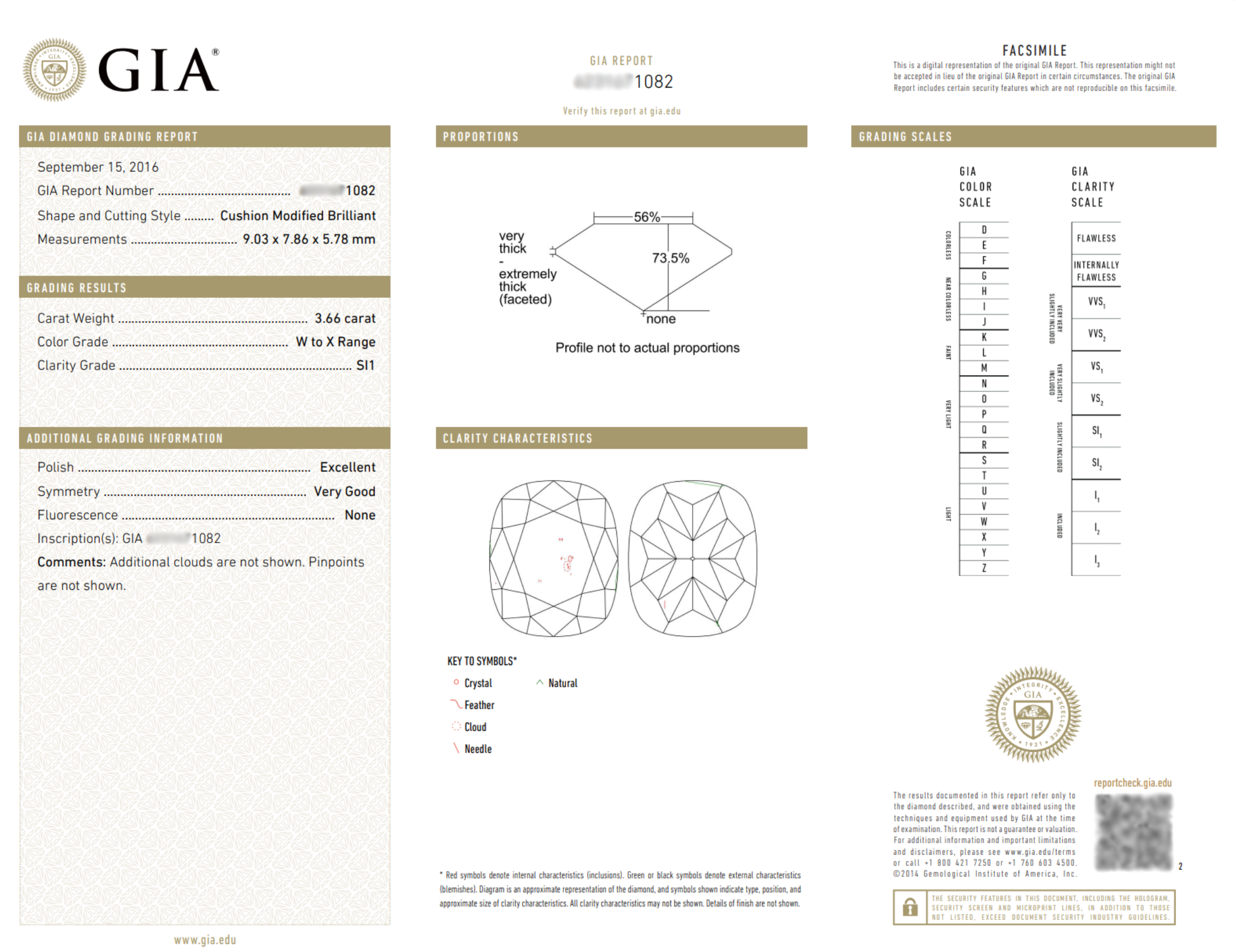 Diamond: 3.66 carat, W-X color, SI1 clarity, GIA