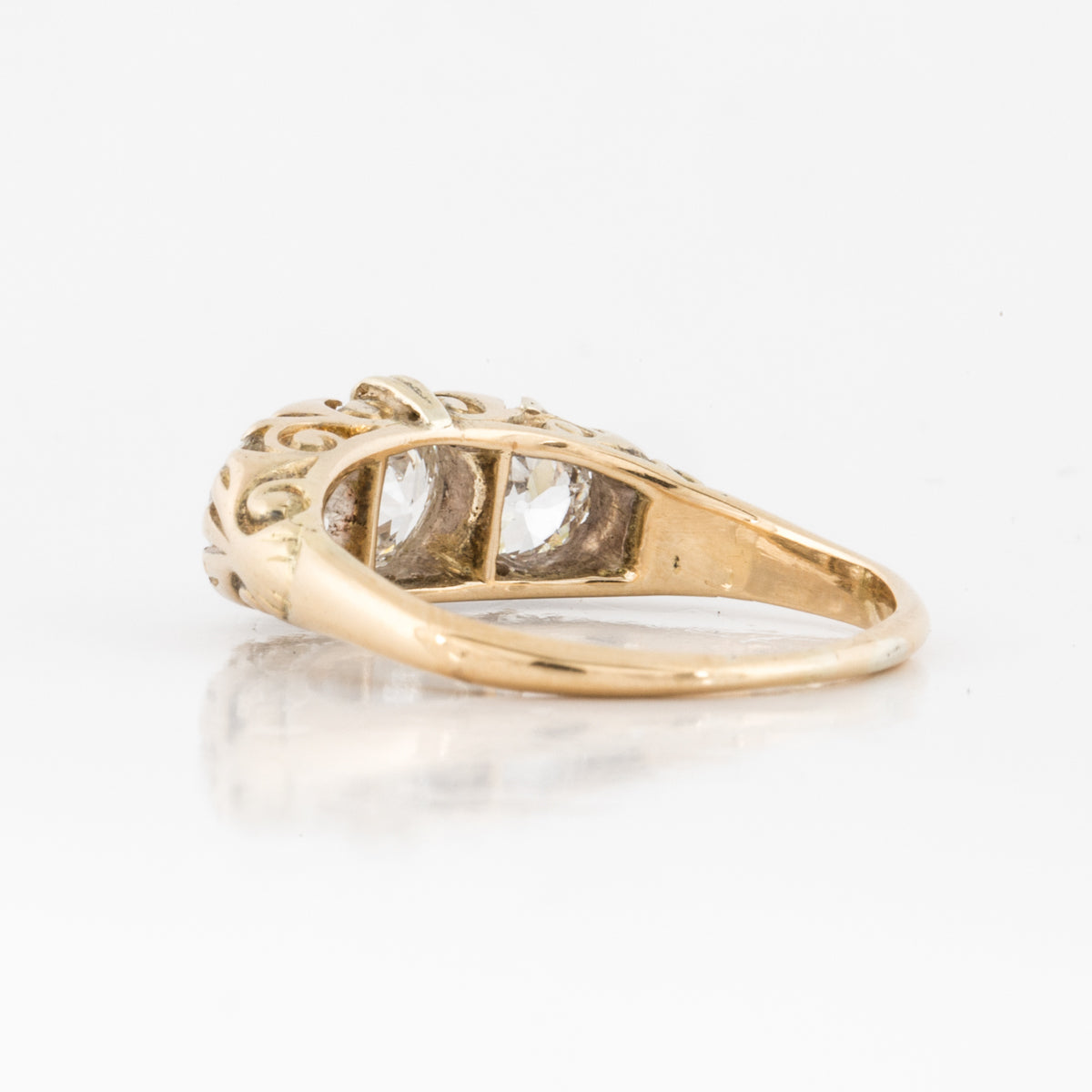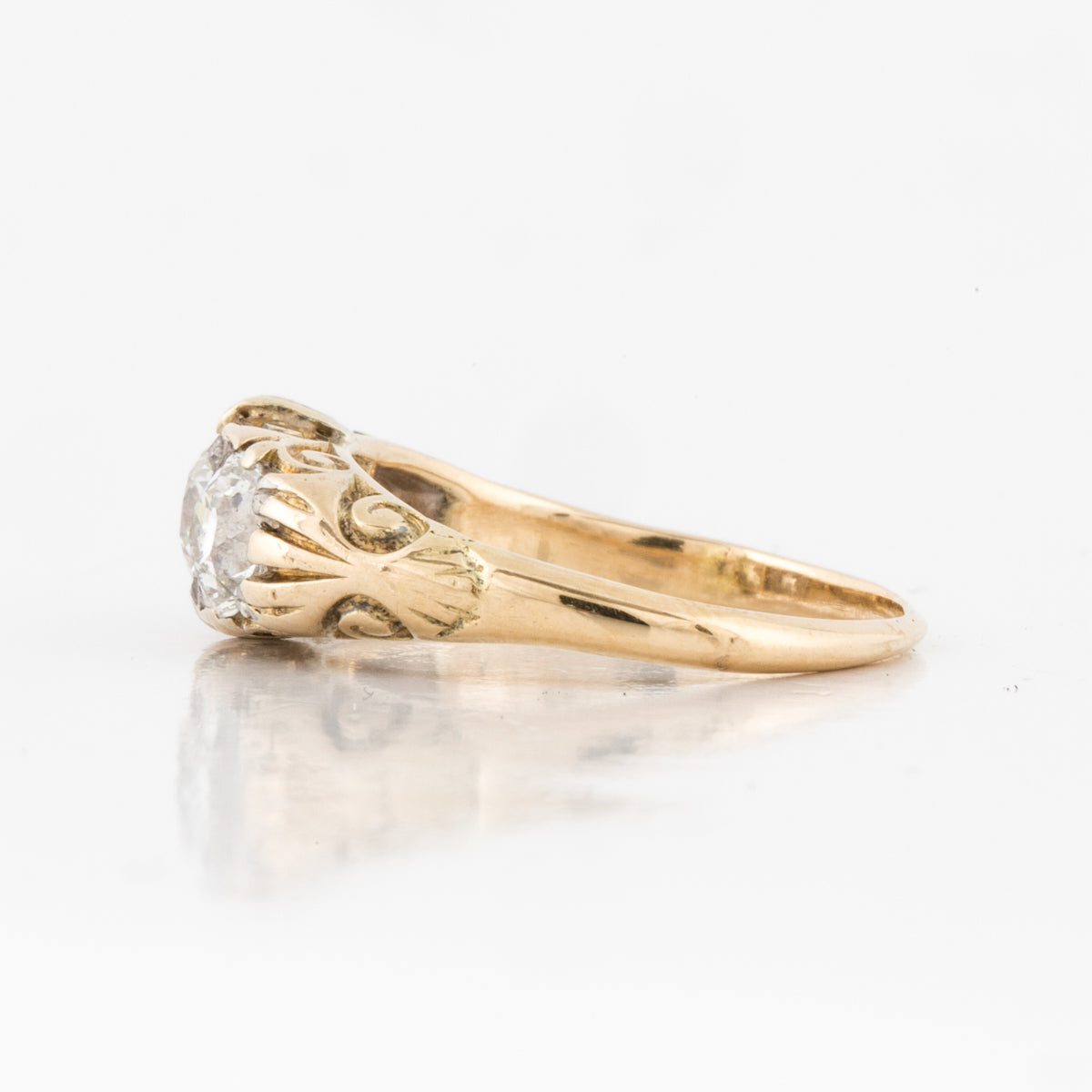 A late Victorian half-hoop Old European-cut diamond three-stone engagement ring, set in 18K yellow gold. Circa 1890.