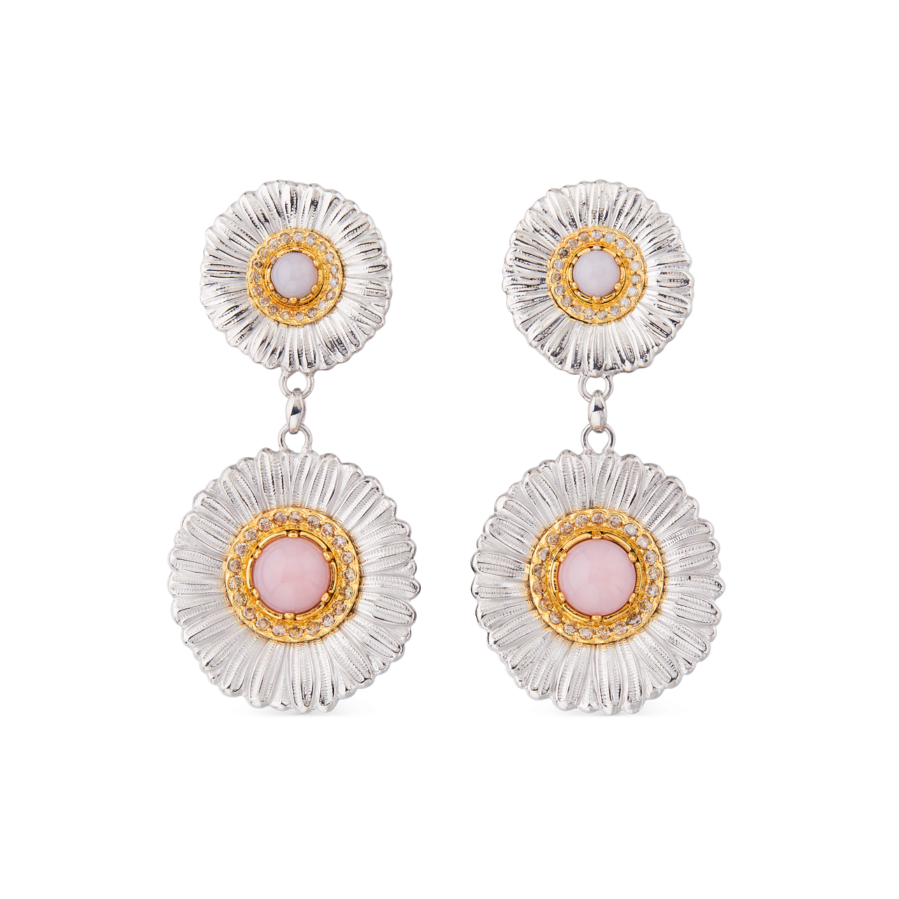 A pair of Buccellati Daisy Blossom Color Collection pendant earrings with opals and diamonds, set in sterling silver and rose gold plated accents.