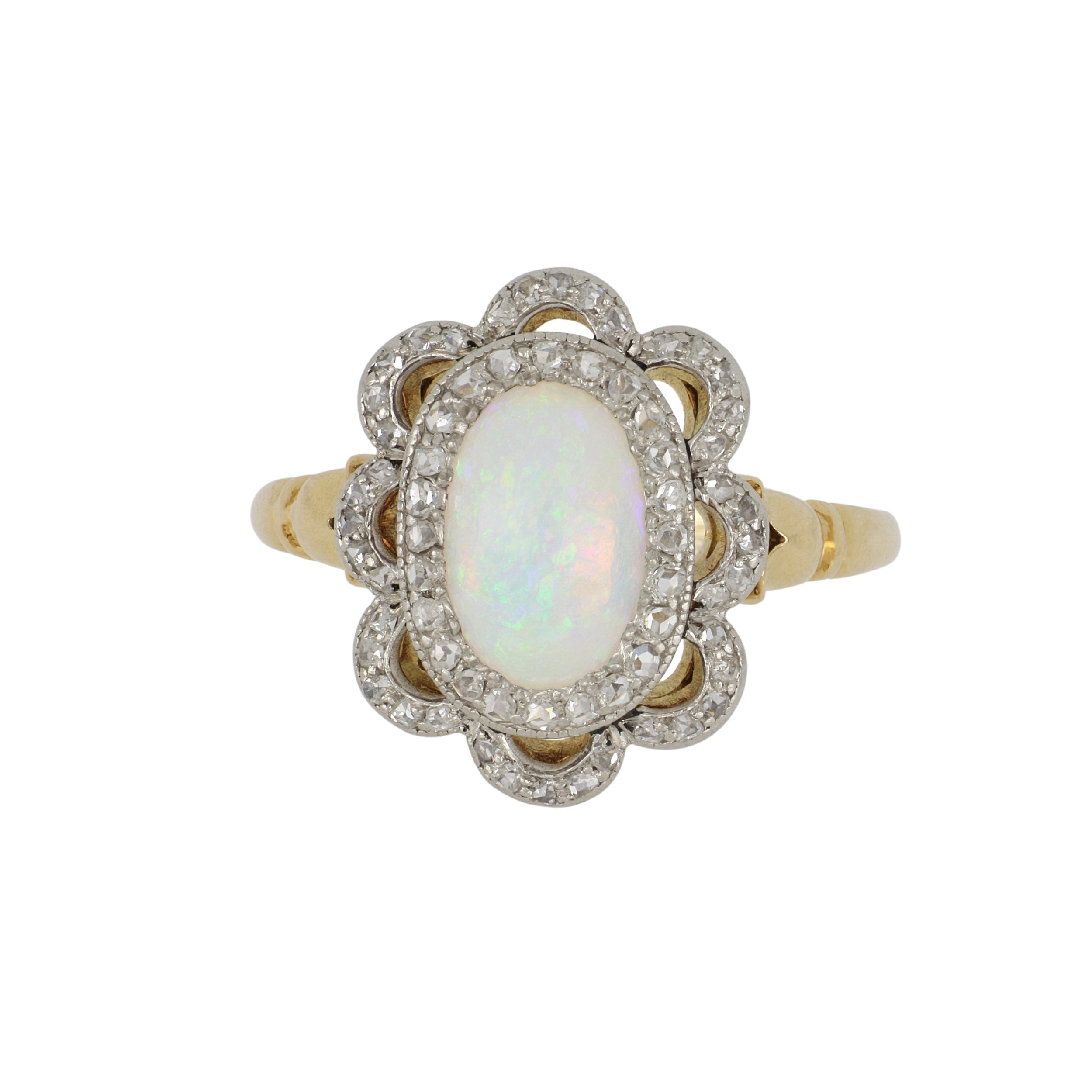 An Edwardian oval opal and rose-cut diamond openwork ring set with a scalloped halo, in sterling silver and 18K yellow gold. Circa 1910.