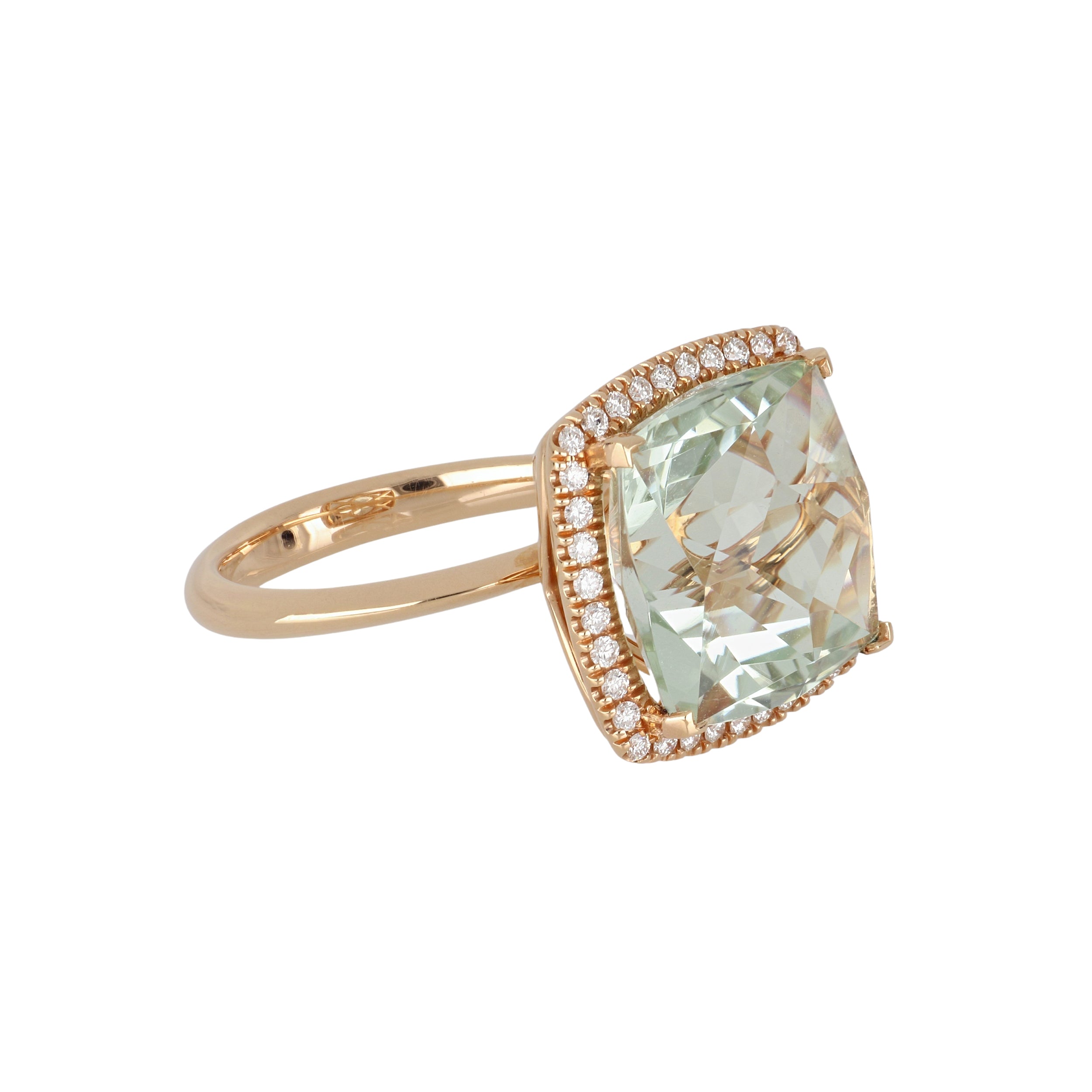 A Lisa Nik 'Rocks' collection ring featuring a cushion-shaped green quartz framed by round diamonds in 18K rose gold.