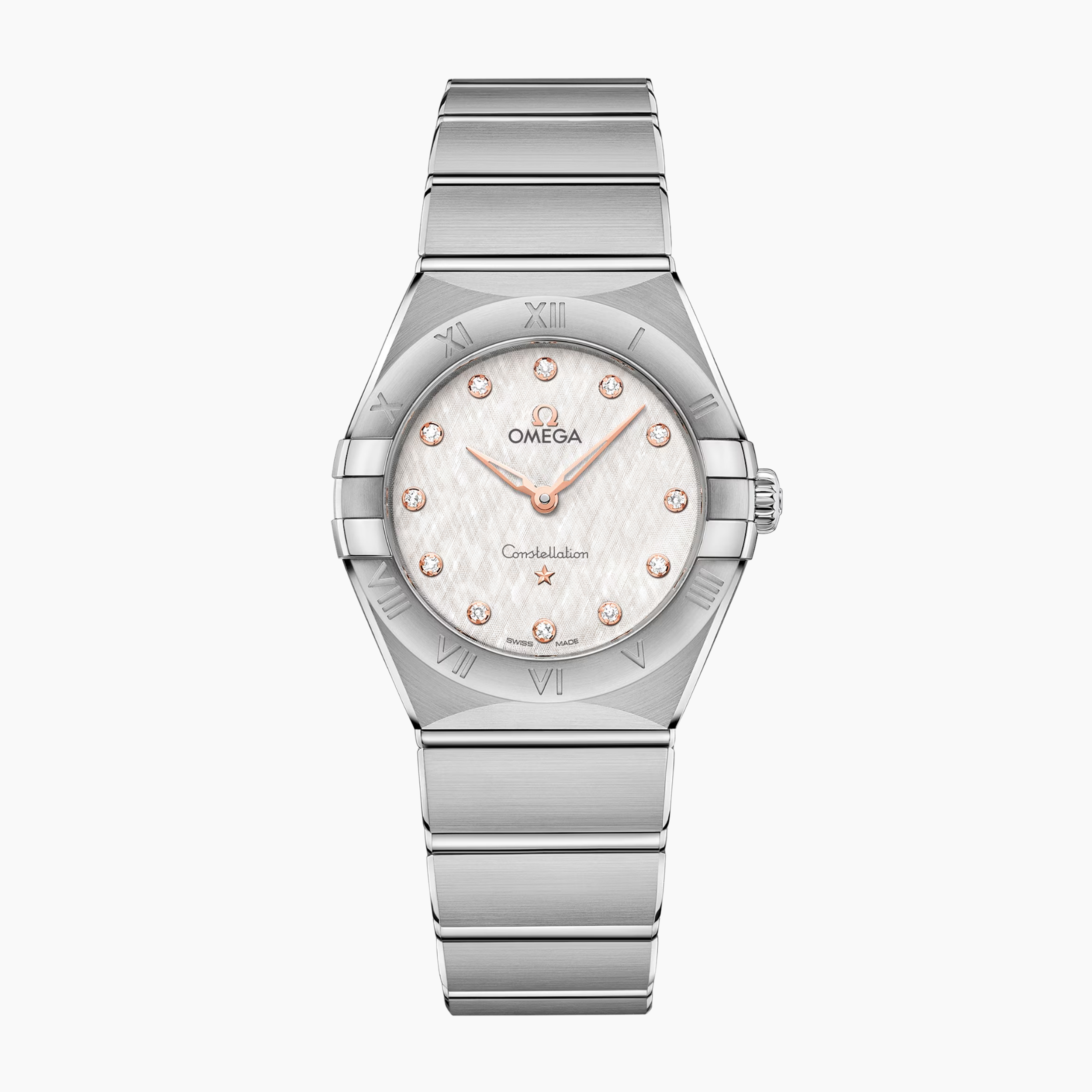 This 28mm stainless steel model features a bezel engraved with Roman numerals, cream silvery dial with silk-like pattern and scratch-resistant sapphire crystal. The hands, OMEGA logo, Constellation star and diamond holders are in 18K Sedna™ gold.