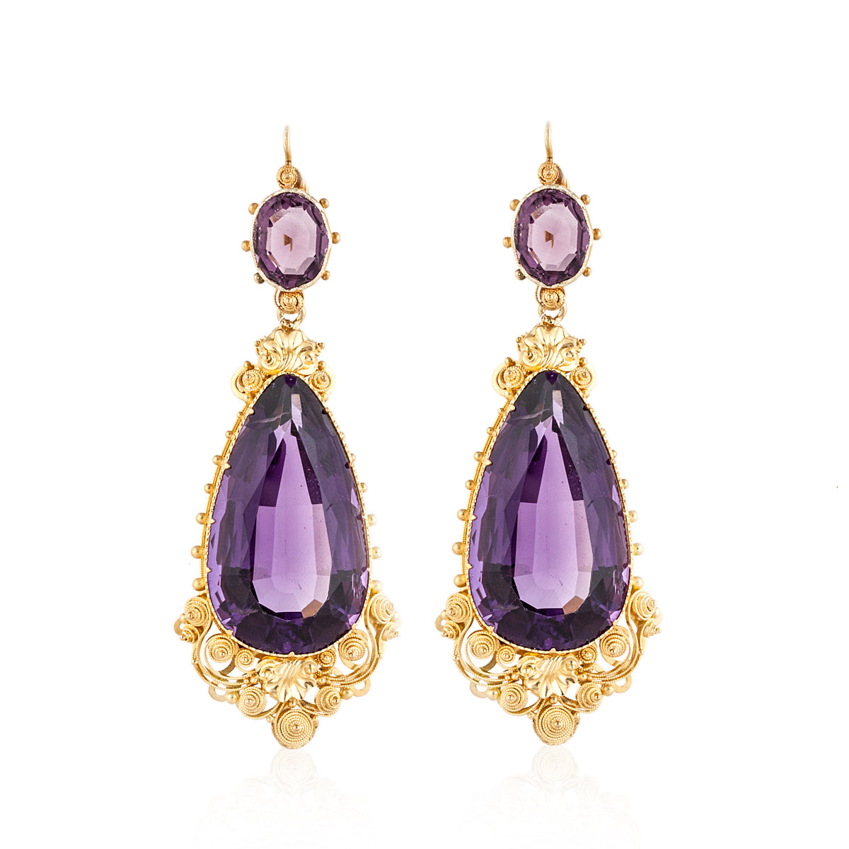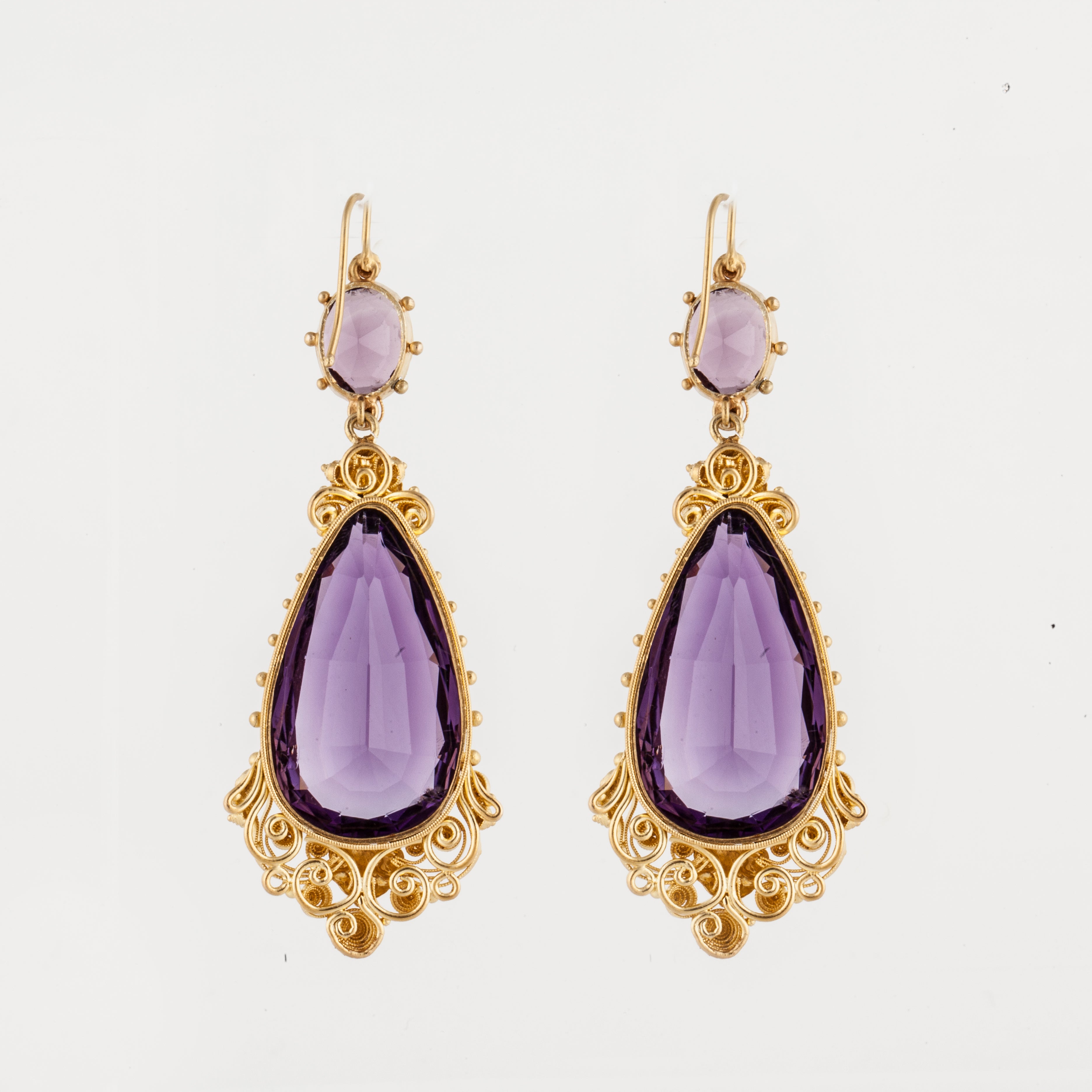 A pair of Georgian oval and pear shape amethyst earrings with cannetille wirework, set in 22K yellow gold. Accompanied with the original box. Circa 1810.