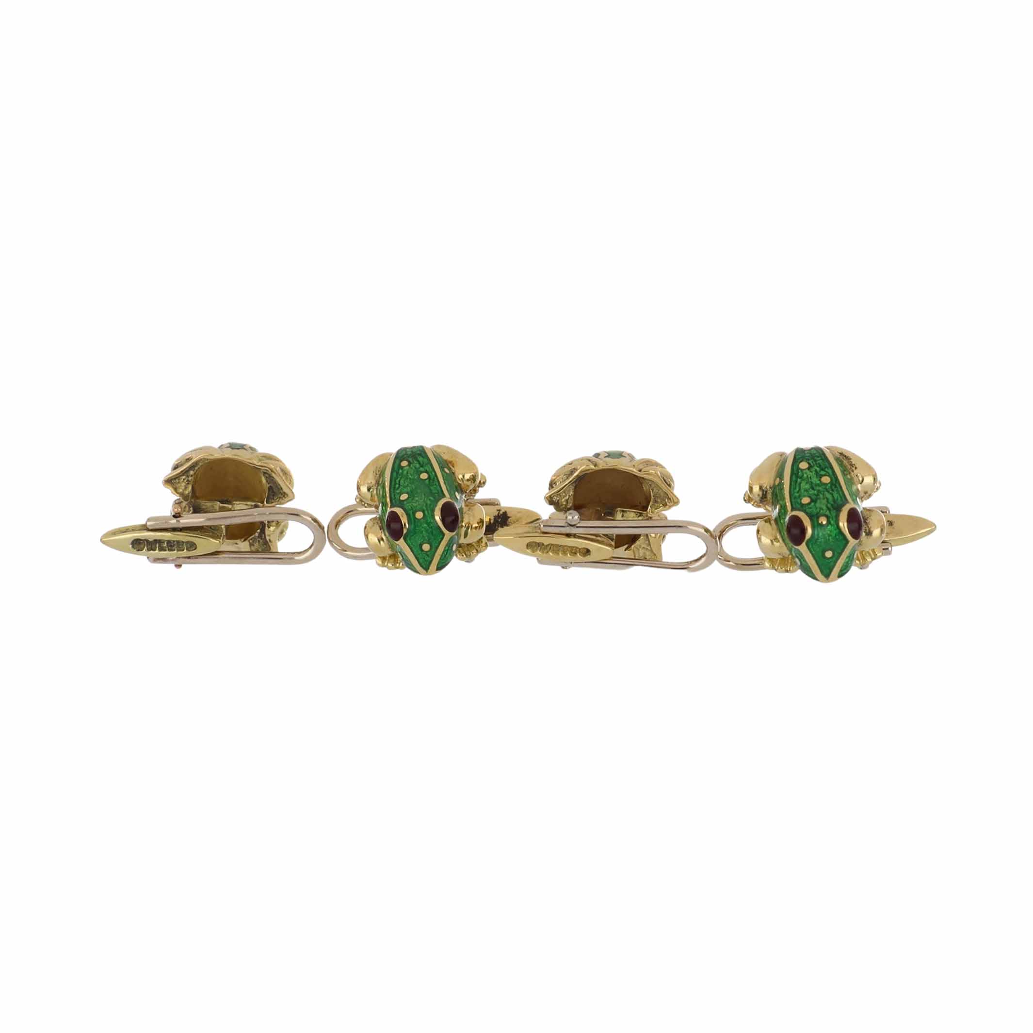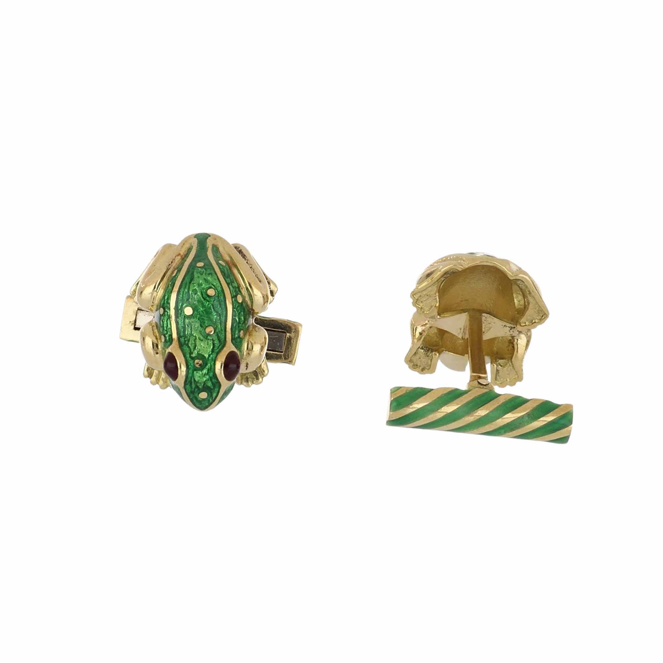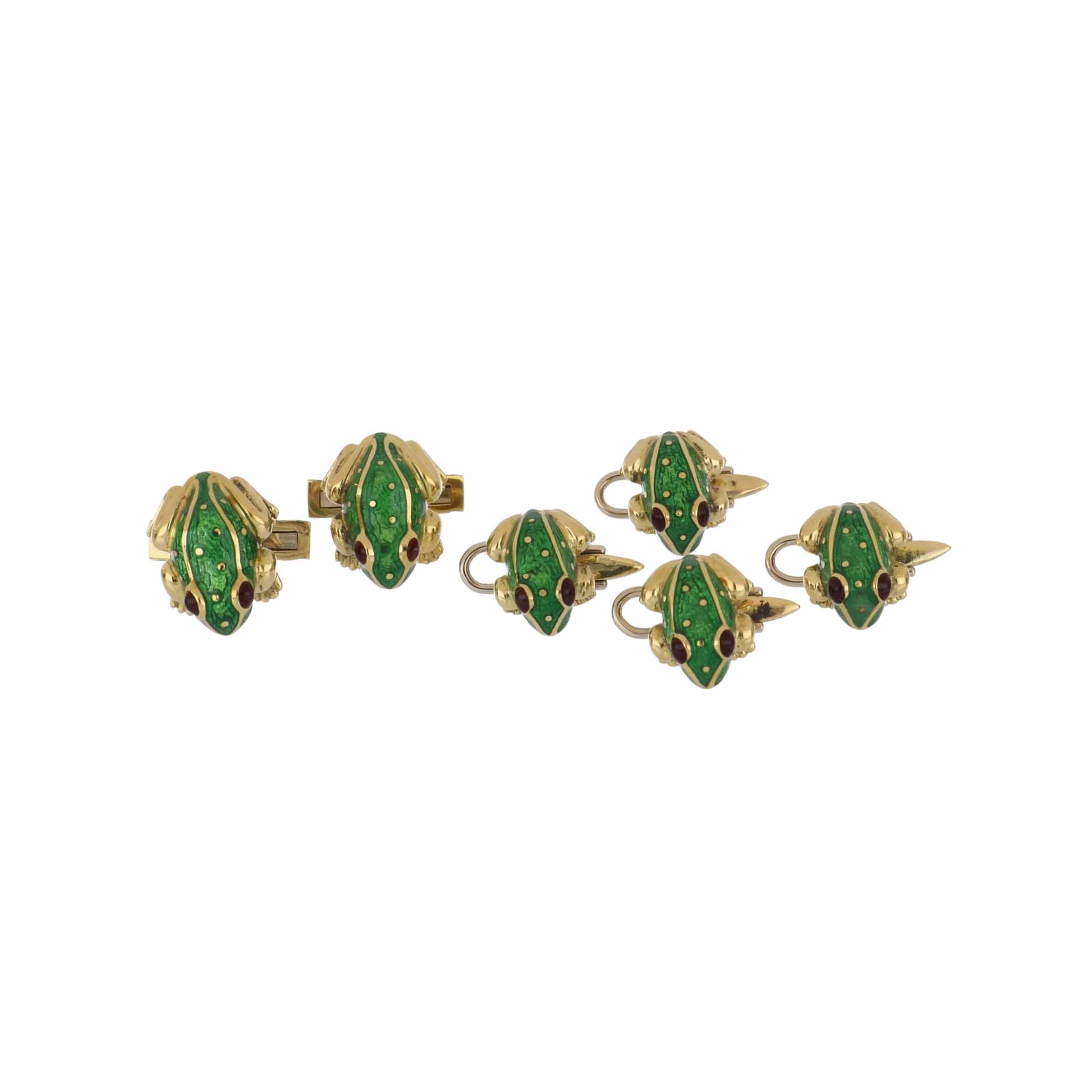 A vintage David Webb 18K yellow gold green enamel frog with ruby eyes dress set.