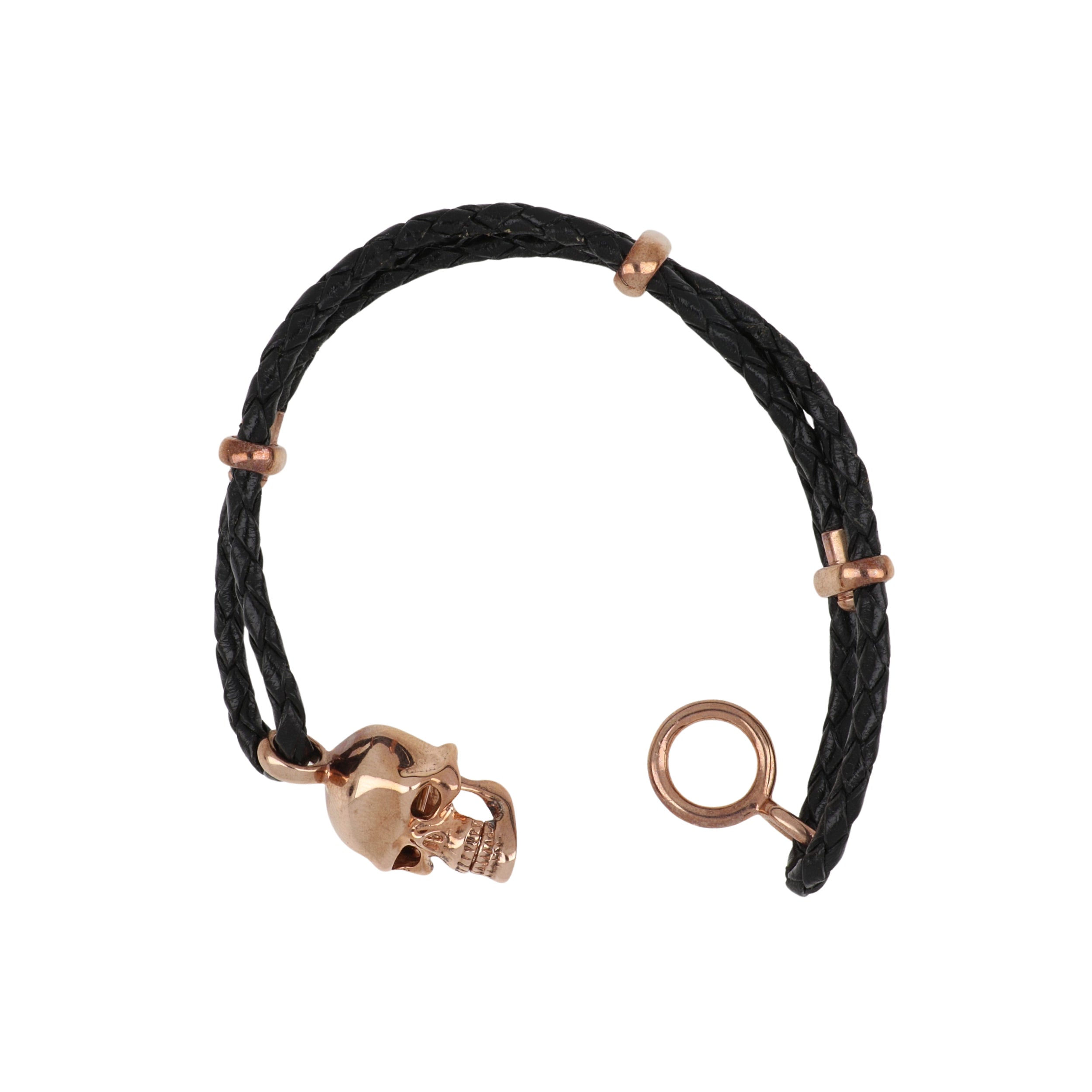 A Deakin & Francis sterling silver black leather adjustable bracelet with skull clasp in polished rose gold finish with white sapphire eyes.