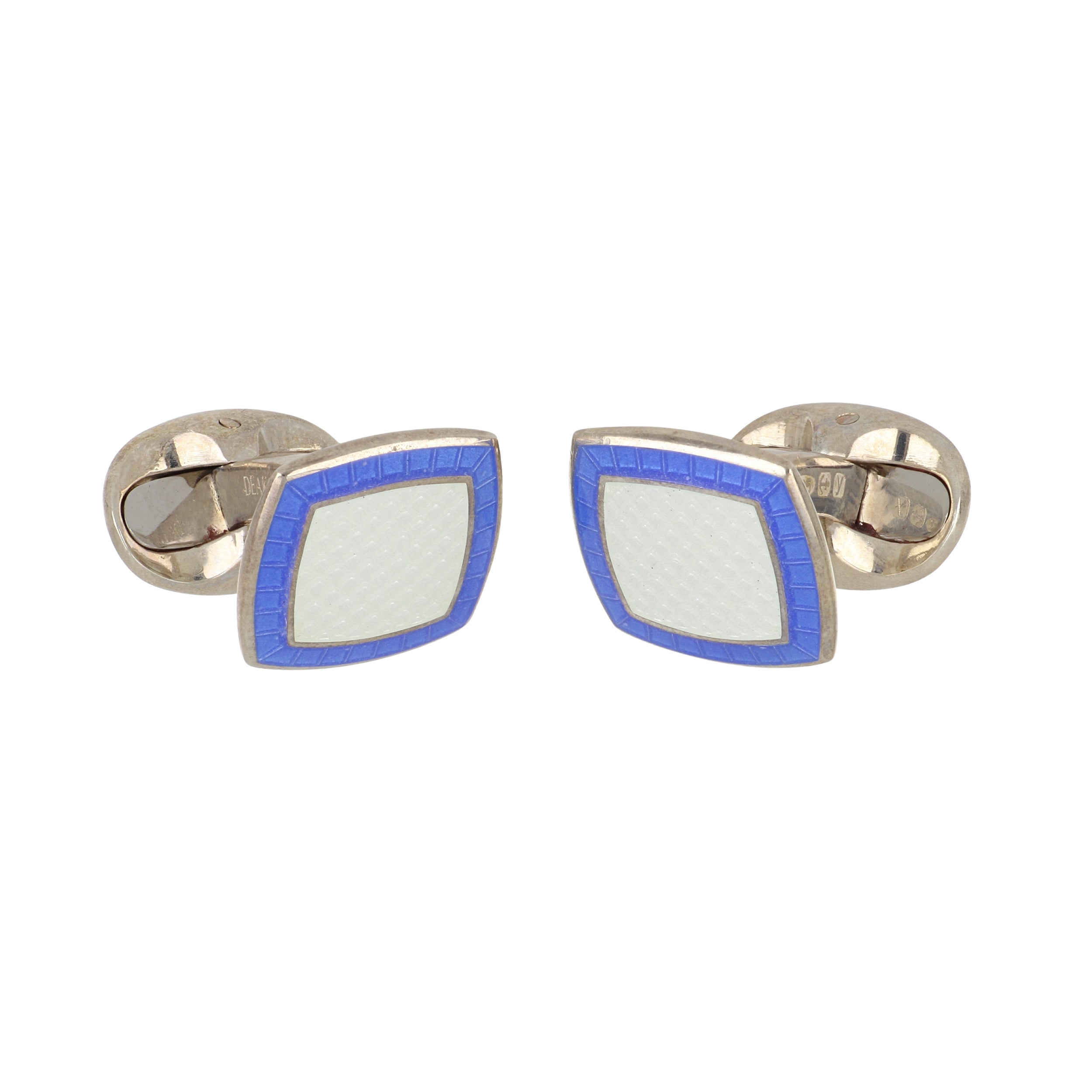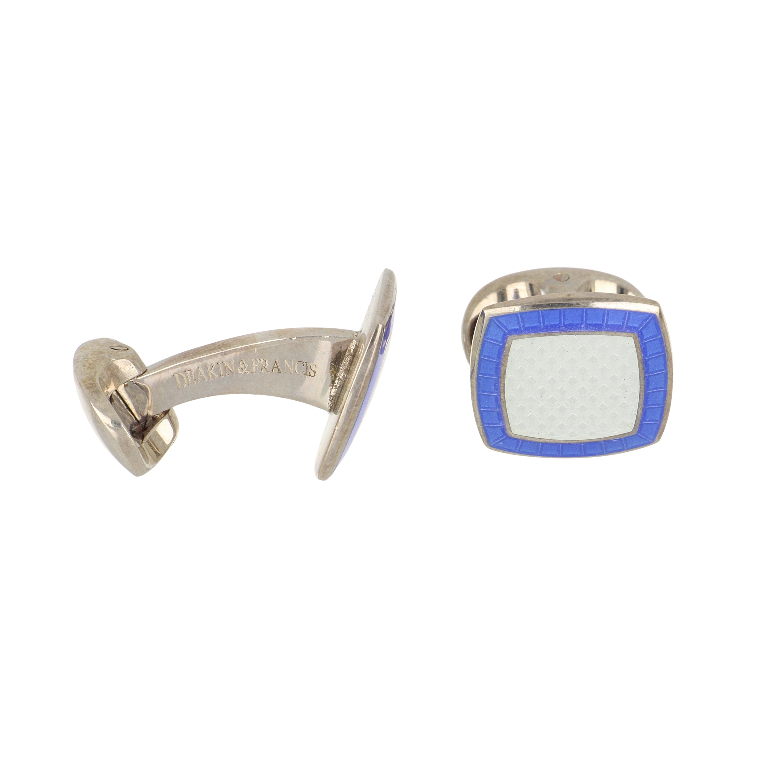 A pair of Deakin & Francis white enamel cufflinks with a blue enamel border in sterling silver.