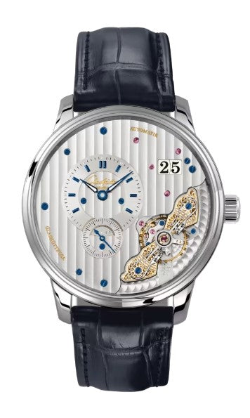 A Glashutte Original PanoMaticInverse watch in stainless steel with an alligator strap.