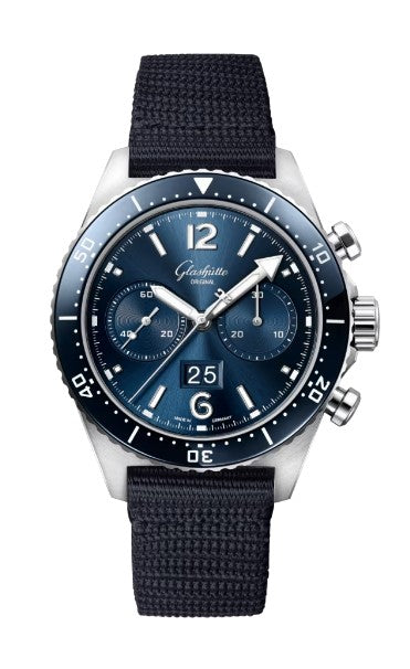 A Glashutte Original Spezialist Collection SeaQ Chronograph watch in stainless steel with a synthetic strap.