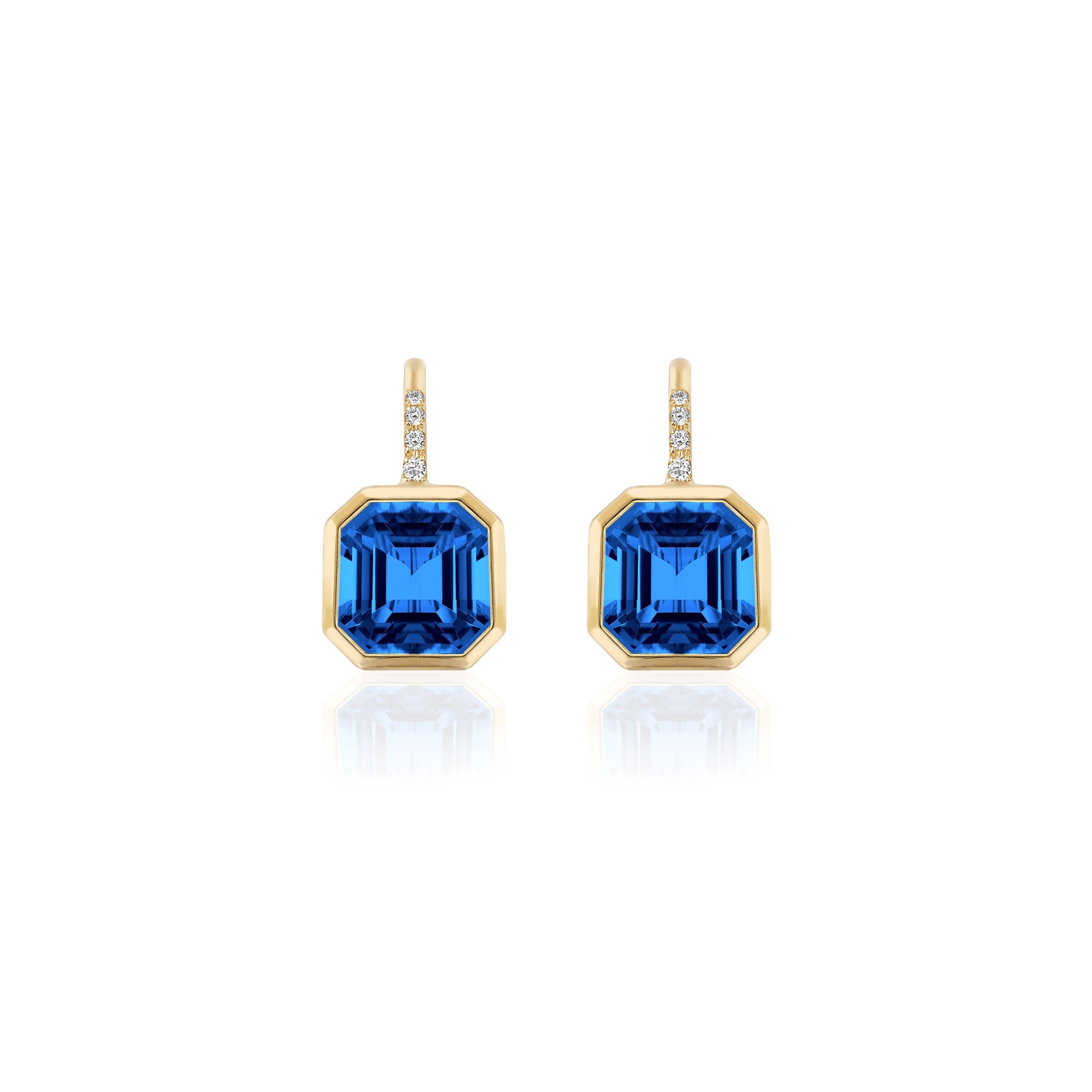 A pair of Goshwara 'Gossip' Collection drop earrings featuring asscher-cut London blue topaz with round diamond accents in 18K yellow gold.