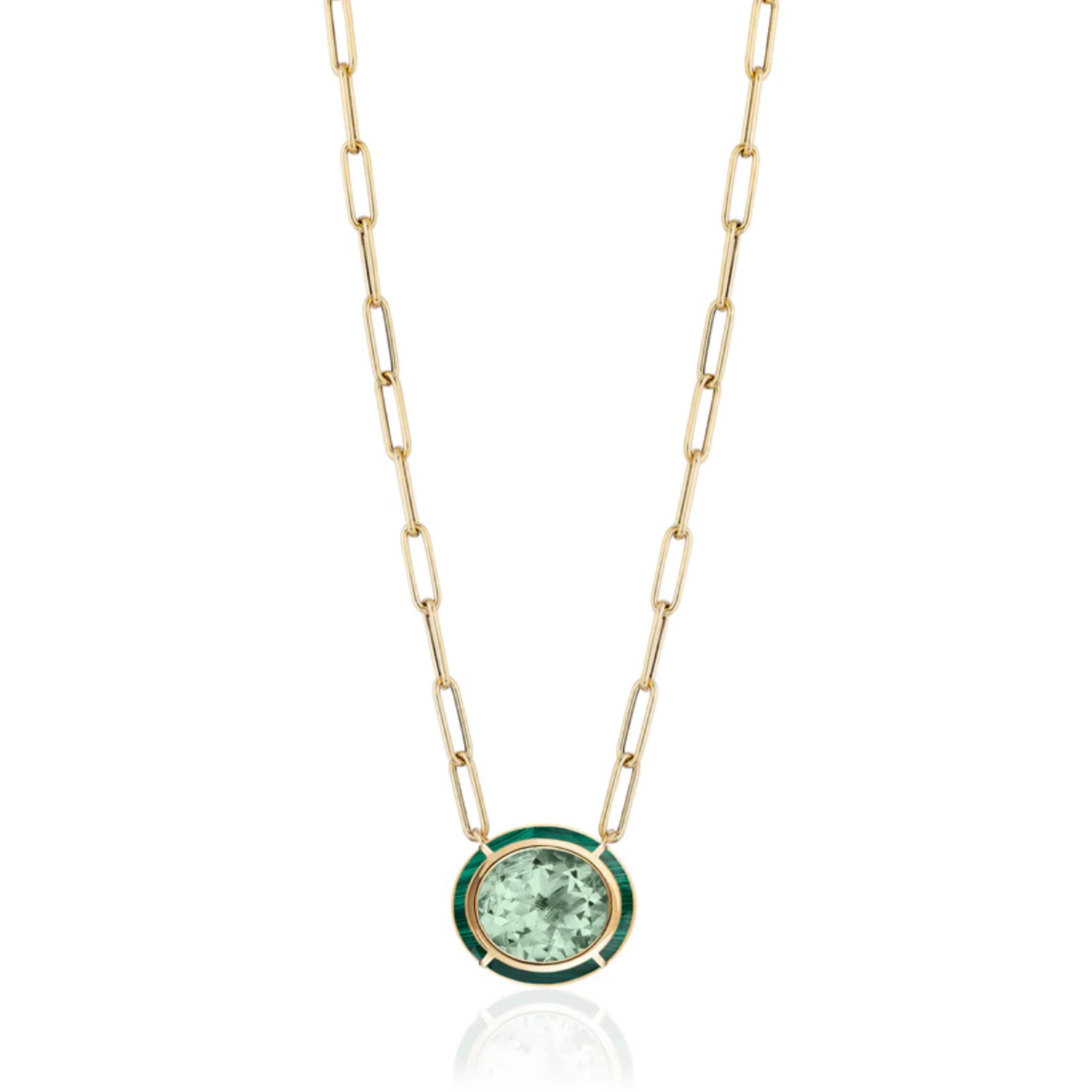 A Goshwara 'Melange' Collection pendant necklace featuring an oval prasiolite framed by inlaid malachite on a paperclip chain in 18K yellow gold.