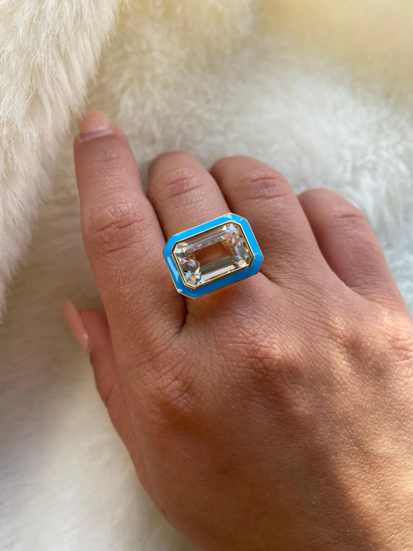 A Goshwara 'Queen' Collection ring featuring an emerald-cut rock crystal stone framed by turquoise enamel in 18K yellow gold.