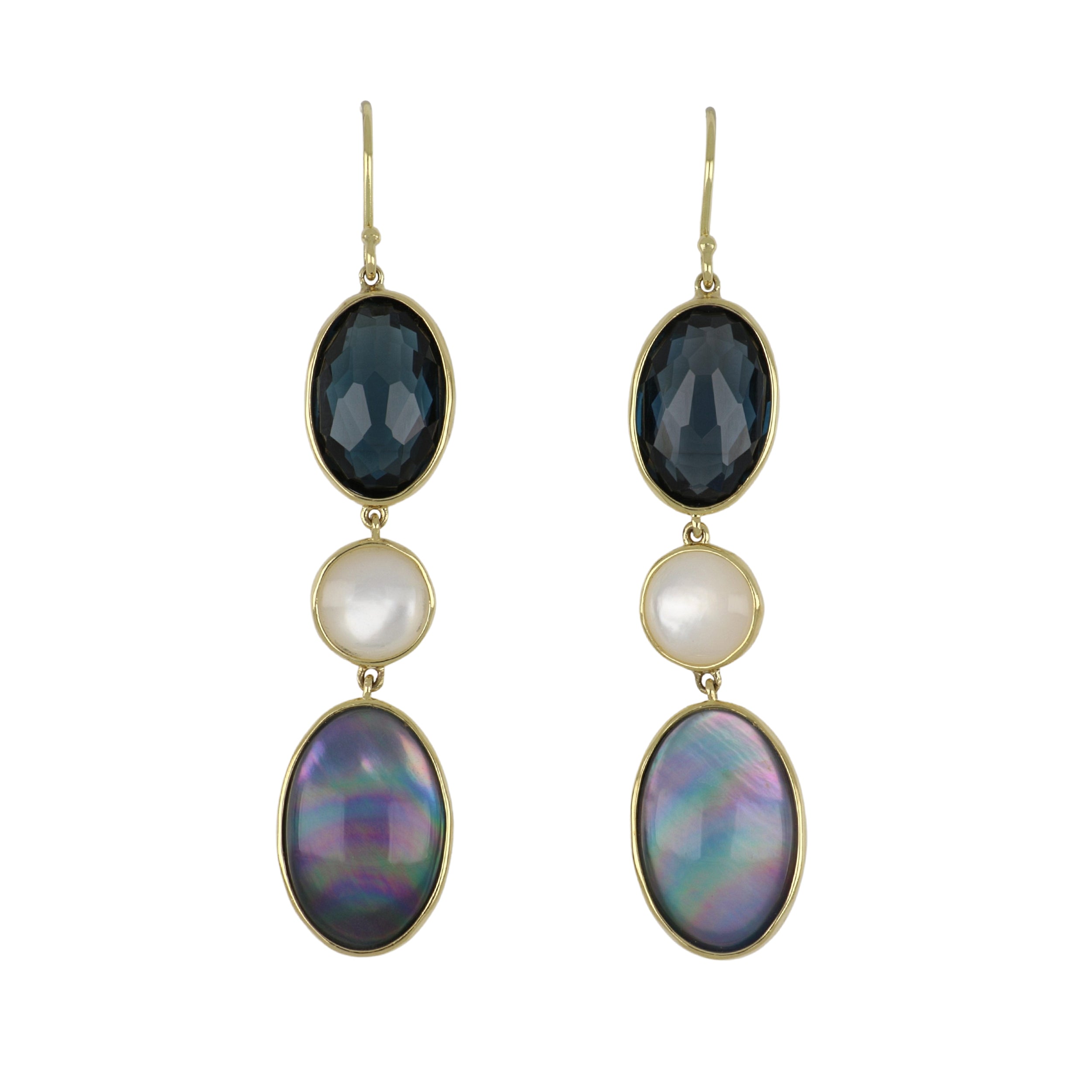 A pair of Ippolita Luce 3 Tier earrings in Blu Notte with mother of pearl, blue topaz, rock crystal and onyx drop earrings, set in 18K yellow gold from the Rock Candy collection.