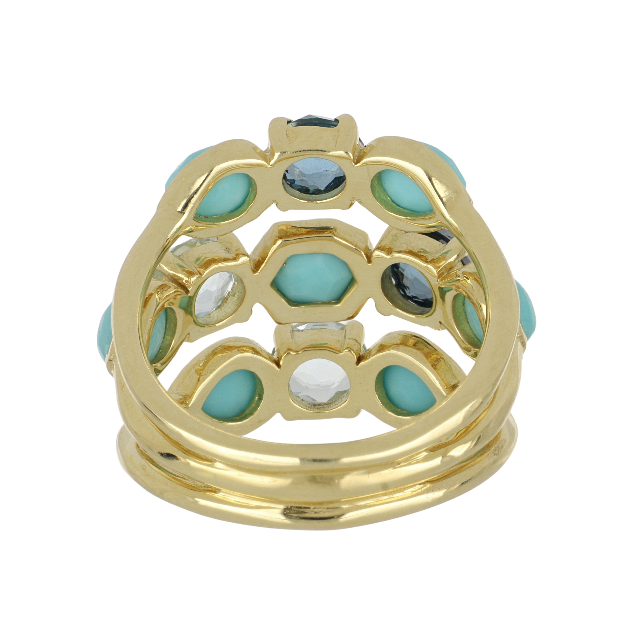 An Ippolita Gelato 3-Band Stack Ring in waterfall with turquoise and various blue topaz from the Rock Candy collection, set in 18K yellow gold.