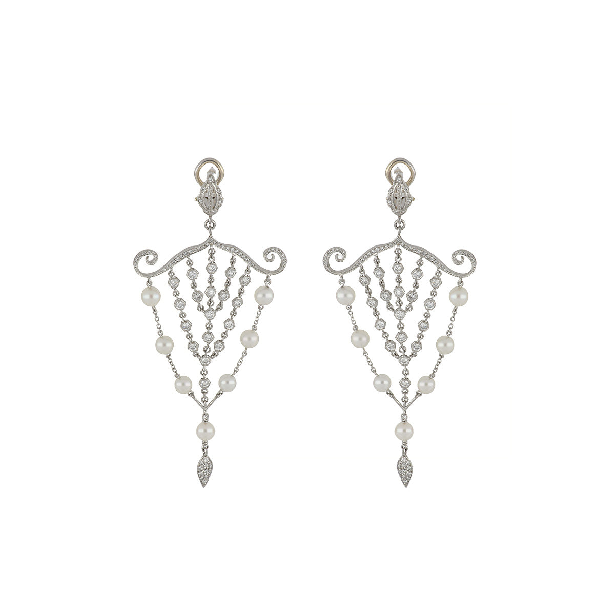 A pair of estate cultured pearl and diamond chandelier earrings, set in platinum.