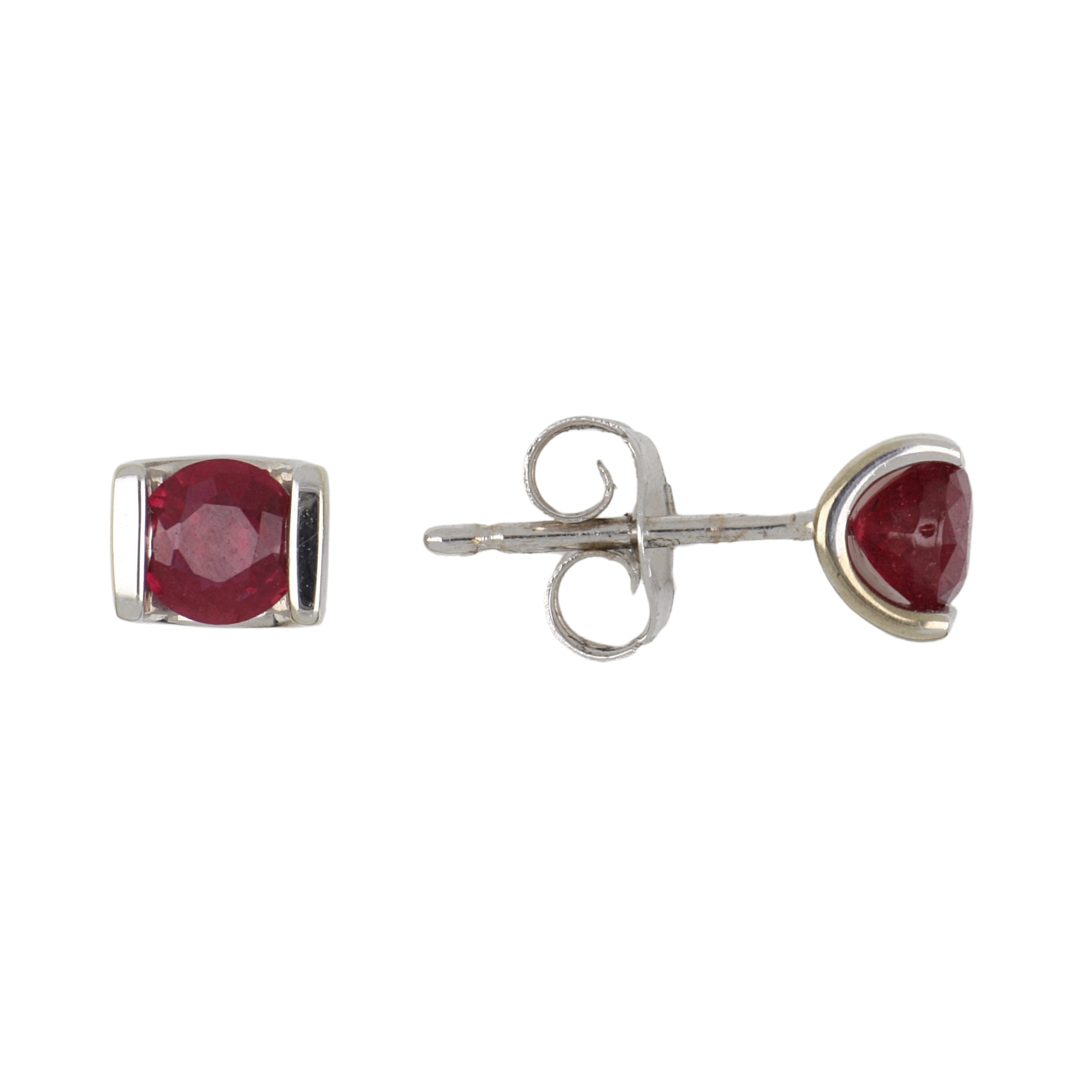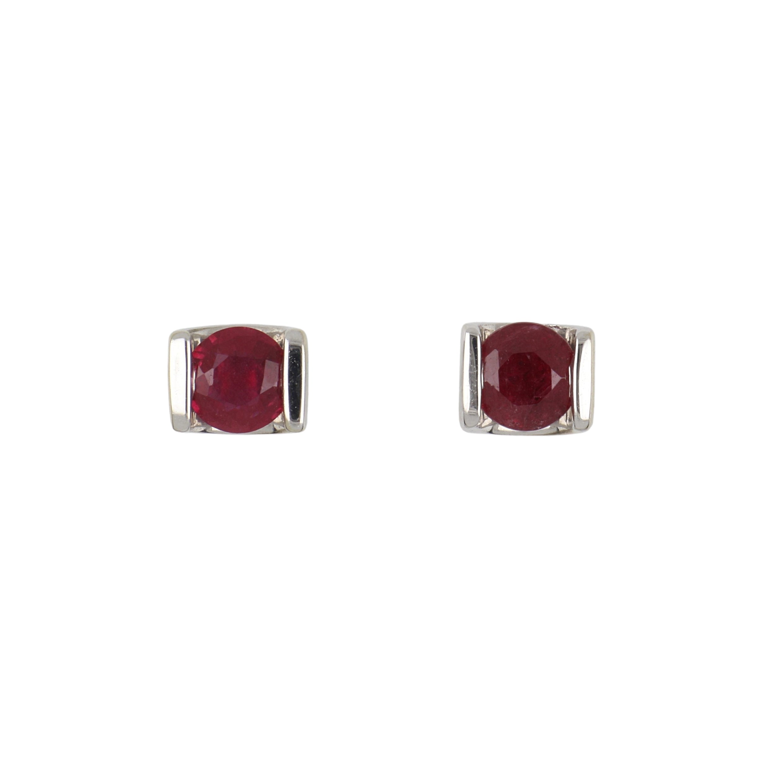 A pair of estate partial bezel-set round ruby stud earrings, set in 10K white gold.