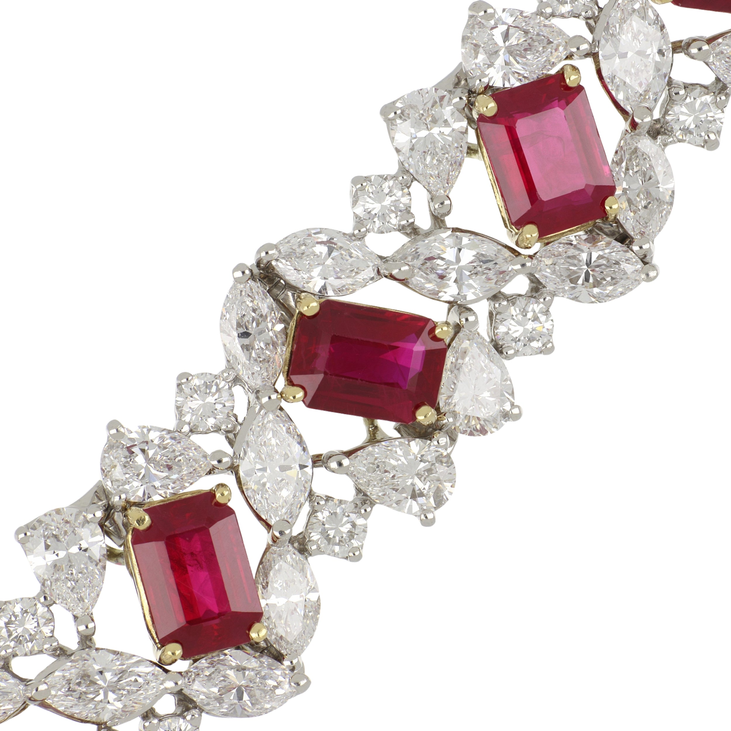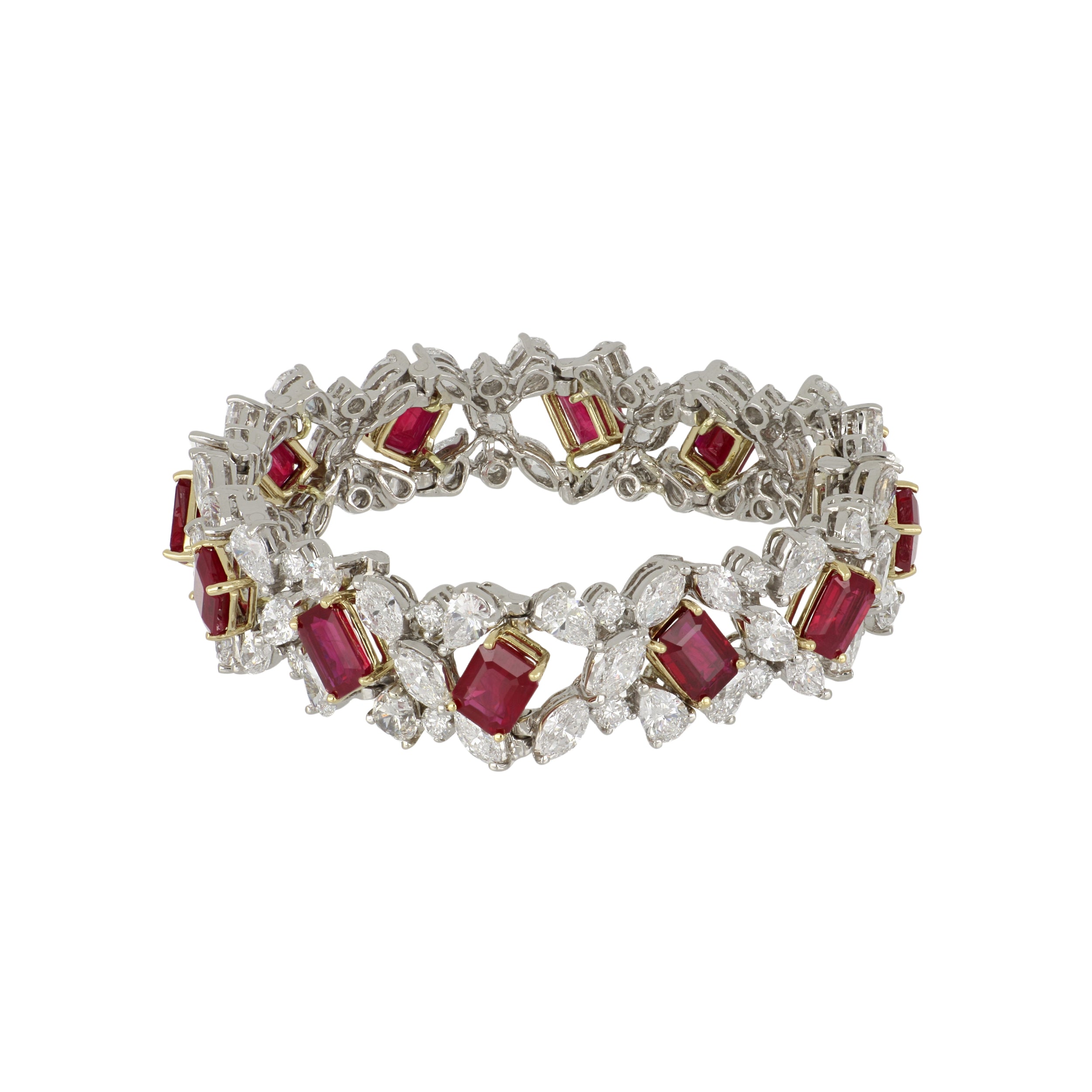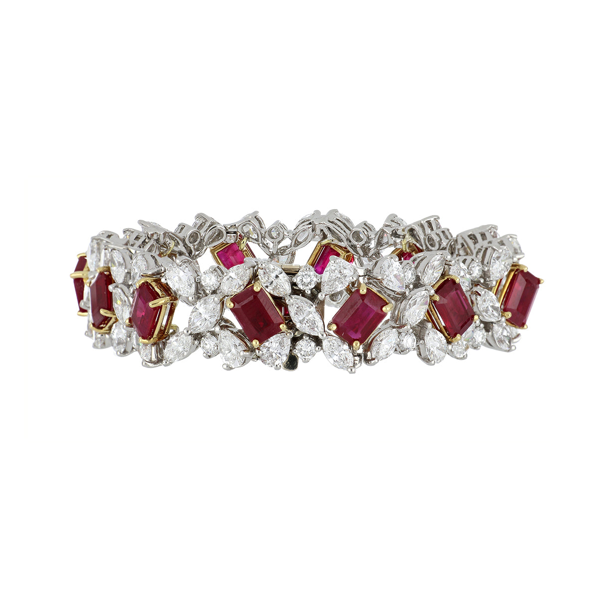 An important estate emerald-cut ruby and mixed-shape diamond, open-design bracelet, set in platinum and 18K yellow gold. Circa 2010.