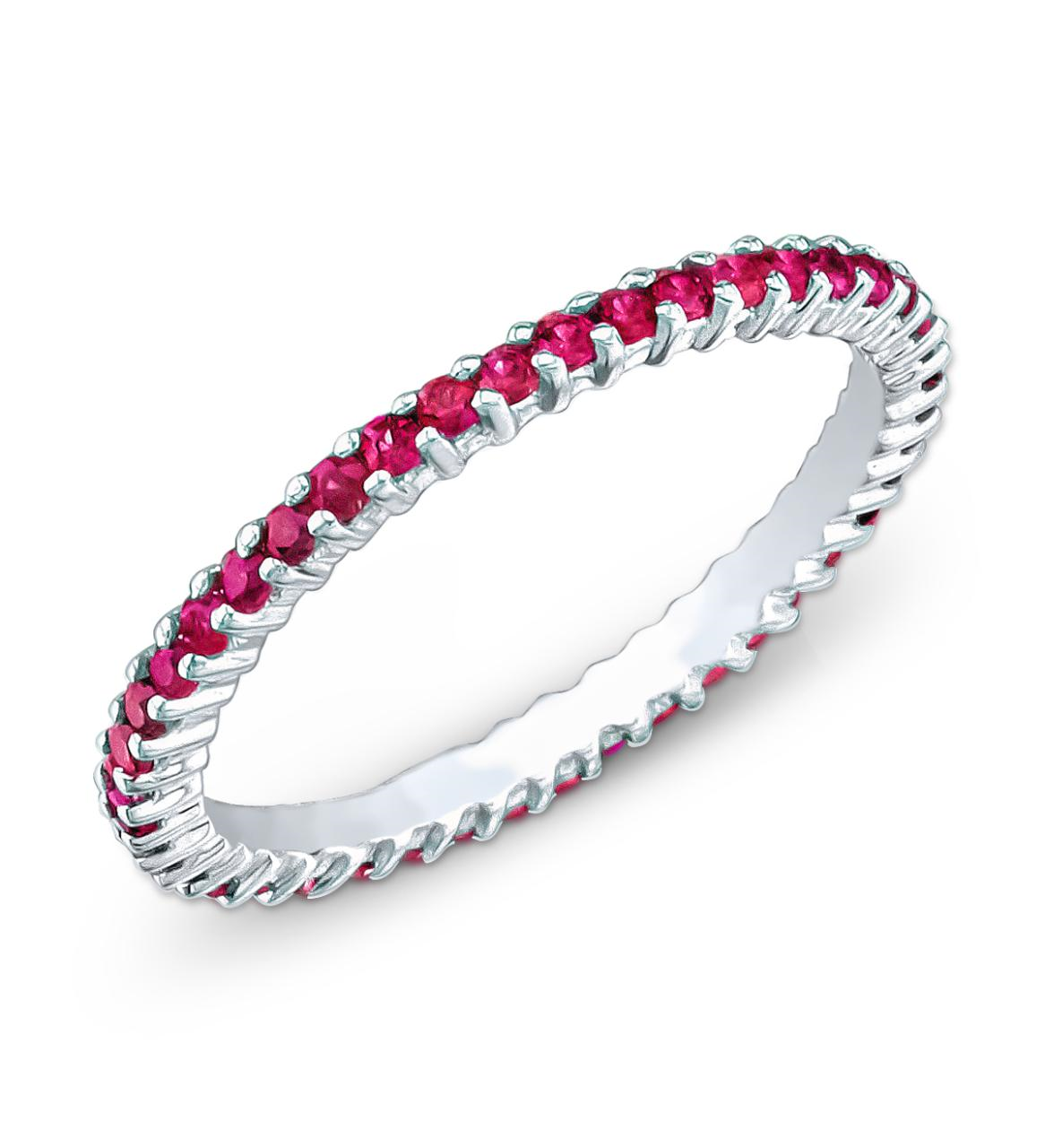 A new shared prong set, round ruby eternity band, set in 18k white gold.
