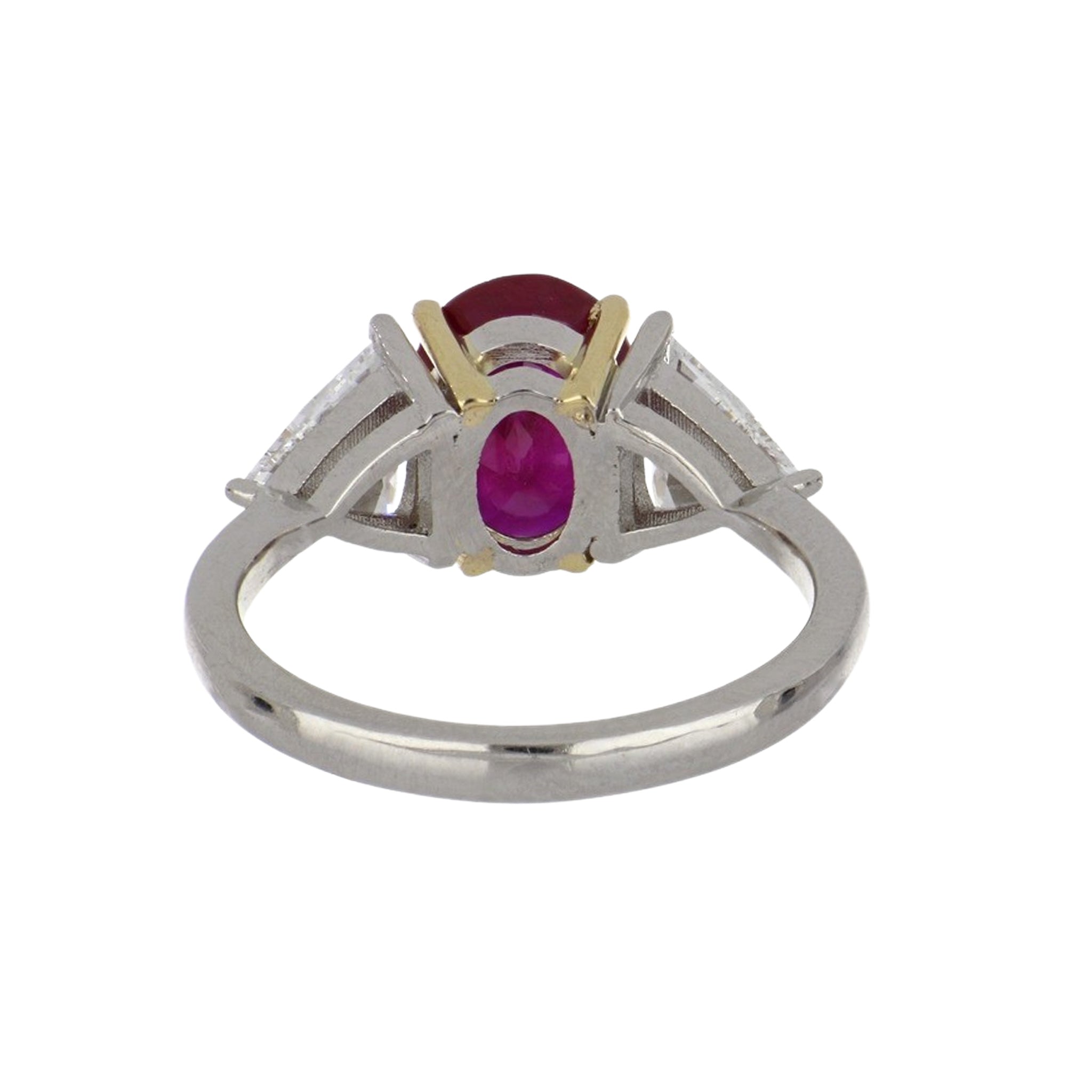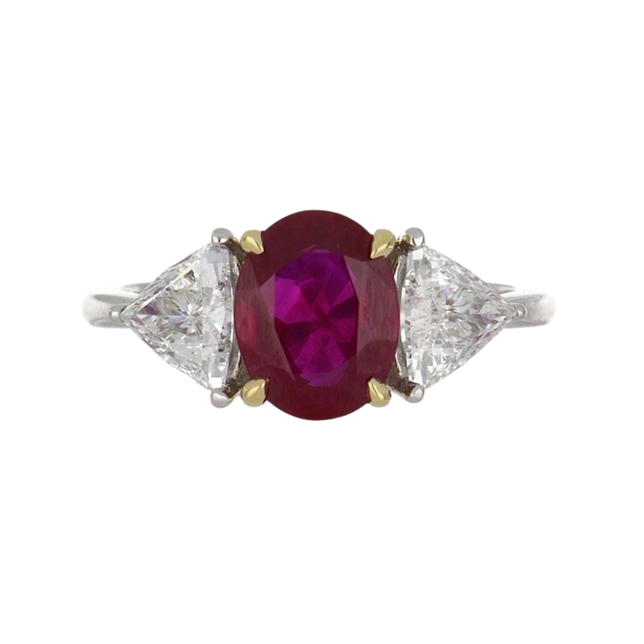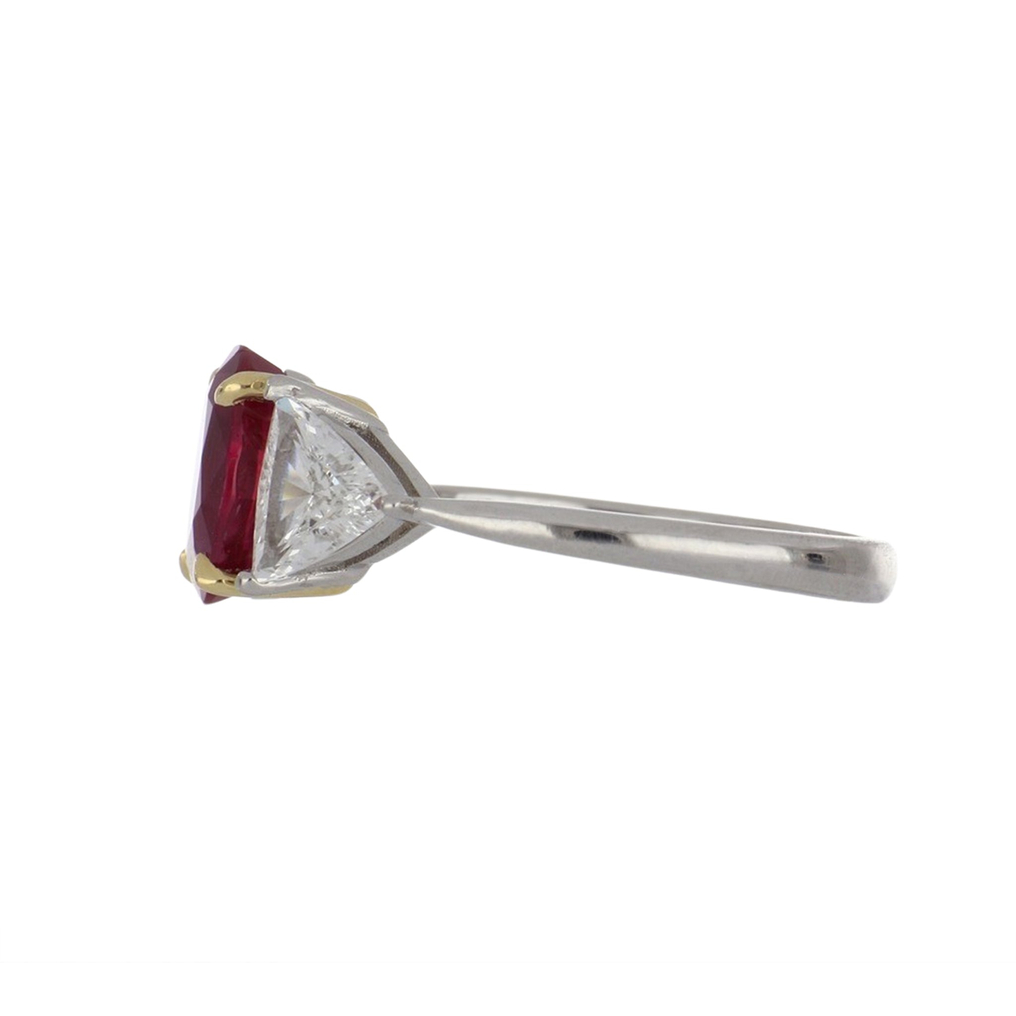 An oval-cut ruby and trillion-cut diamond three stone ring, set in platinum with yellow gold prongs.