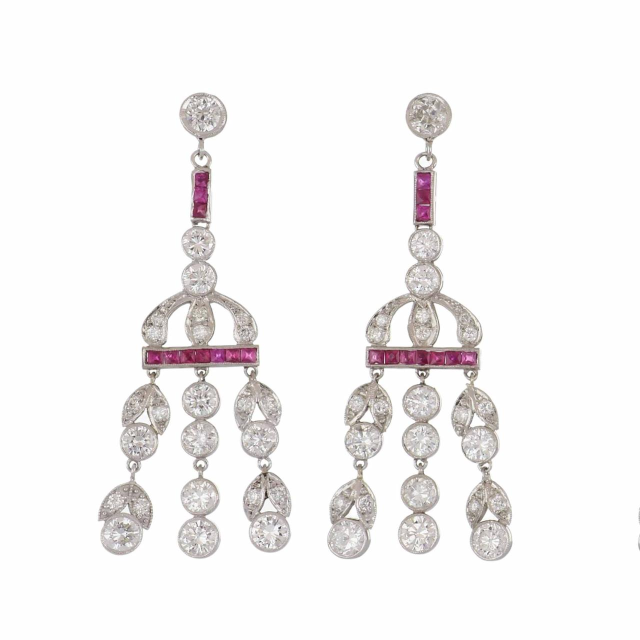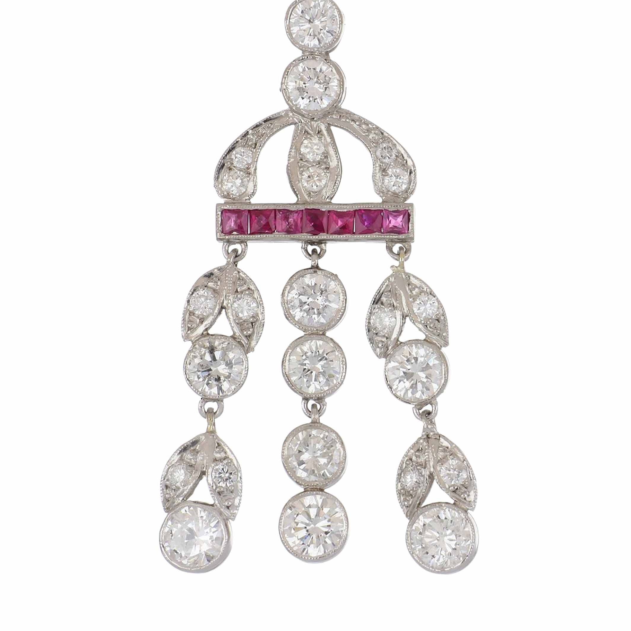A pair of antique-style bespoke, calibre-cut ruby and round diamond multi-drop earrings set in platinum. Circa 1990