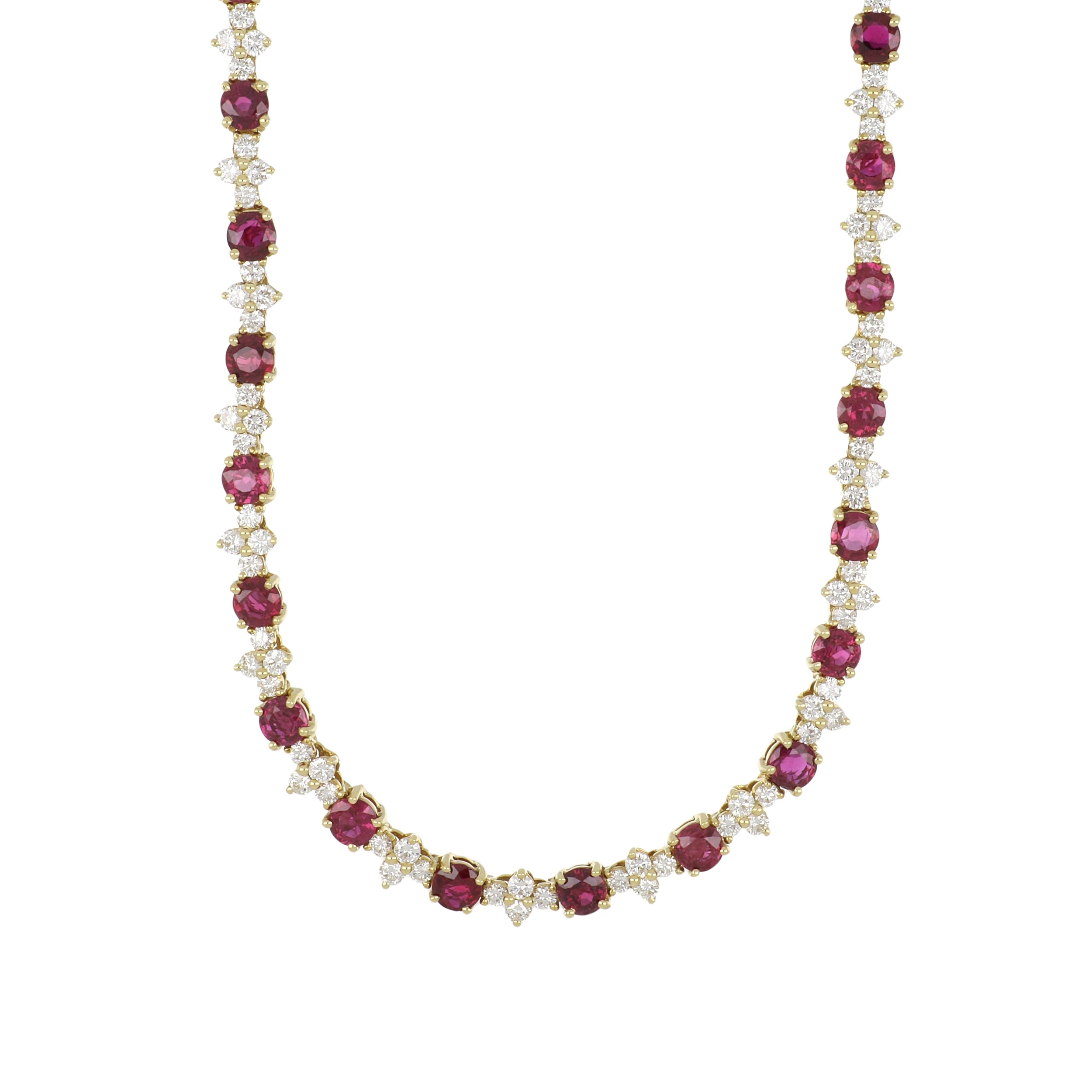 A vintage Tiffany & Co, alternating round-cut ruby and round brilliant-cut diamond link necklace set in 18K yellow gold. The necklace lays flat in one direction and curves in the other as to sit "upright" on the neck. Circa 1990.