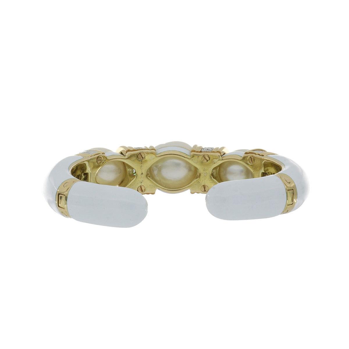 A new David Webb white enamel cuff bracelet with baroque South Sea pearls and diamonds, set in platinum and 18K yellow gold. From the Manhattan Minimalism Collection.