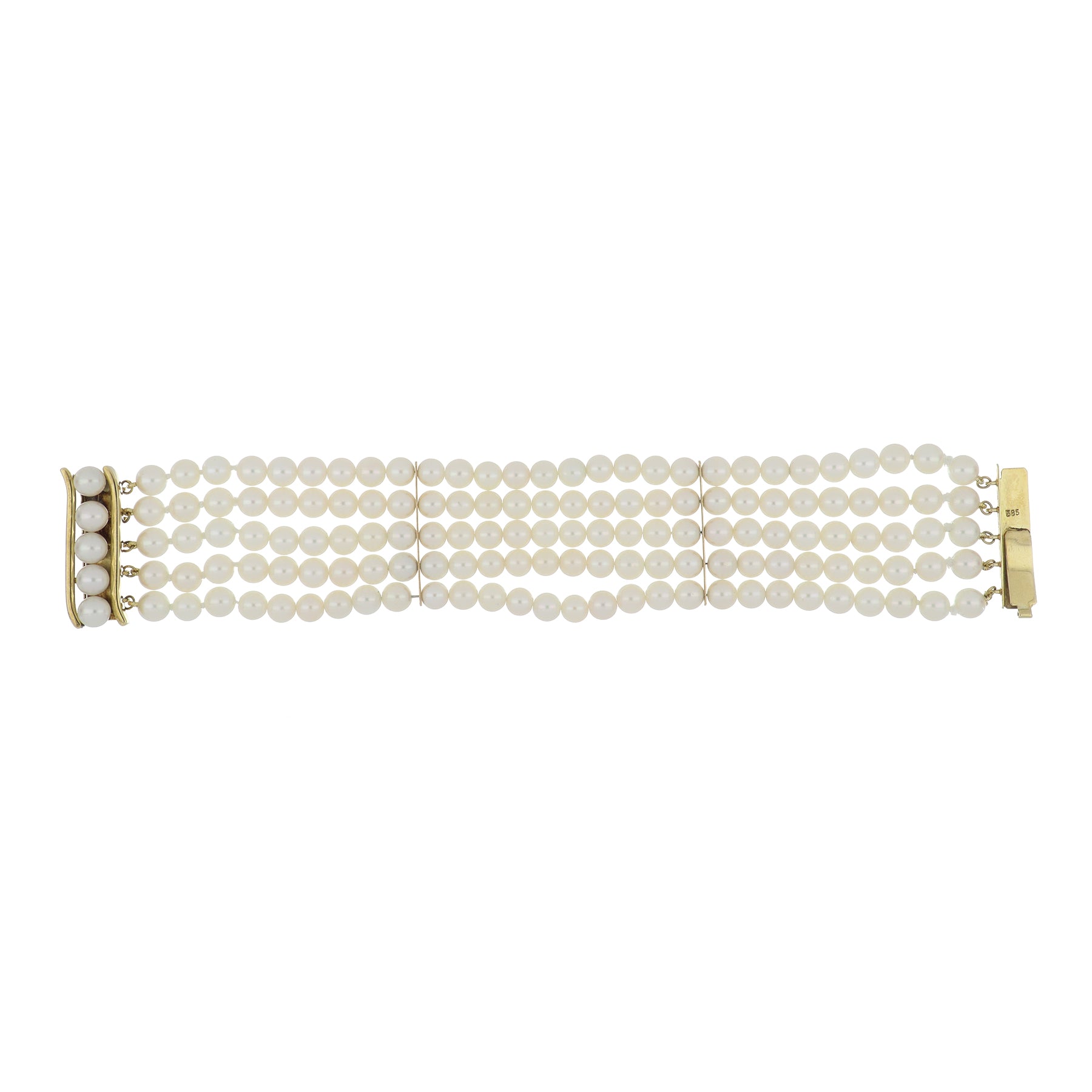 An estate 14 karat yellow gold 5-strand cultured akoya pearl bracelet.Vintage & Estate CollectionAkoya pearls=5.5-6.0mm7 1/8 in