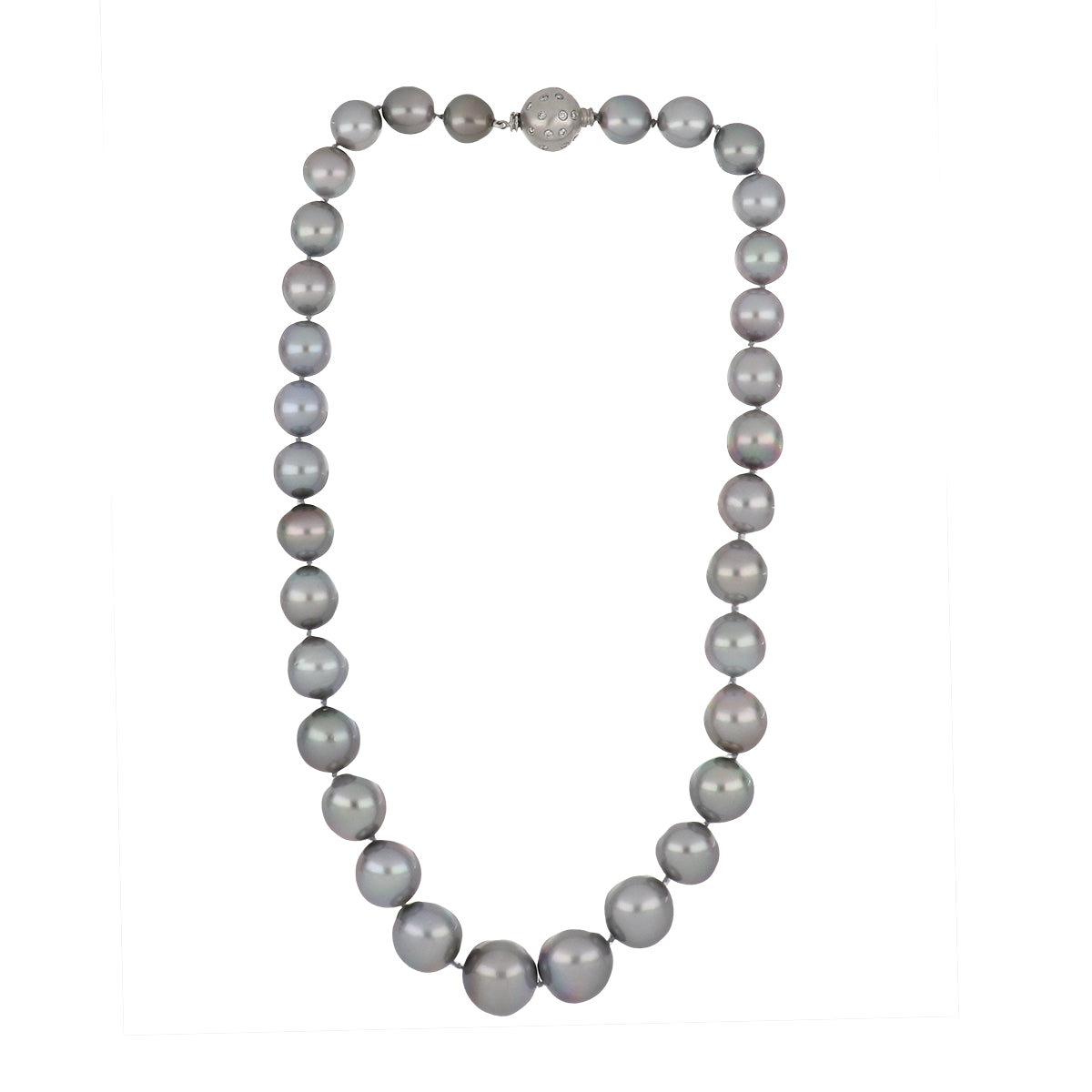 An estate graduated gray Tahitian pearl single strand necklace with a 14K white gold diamond ball clasp.