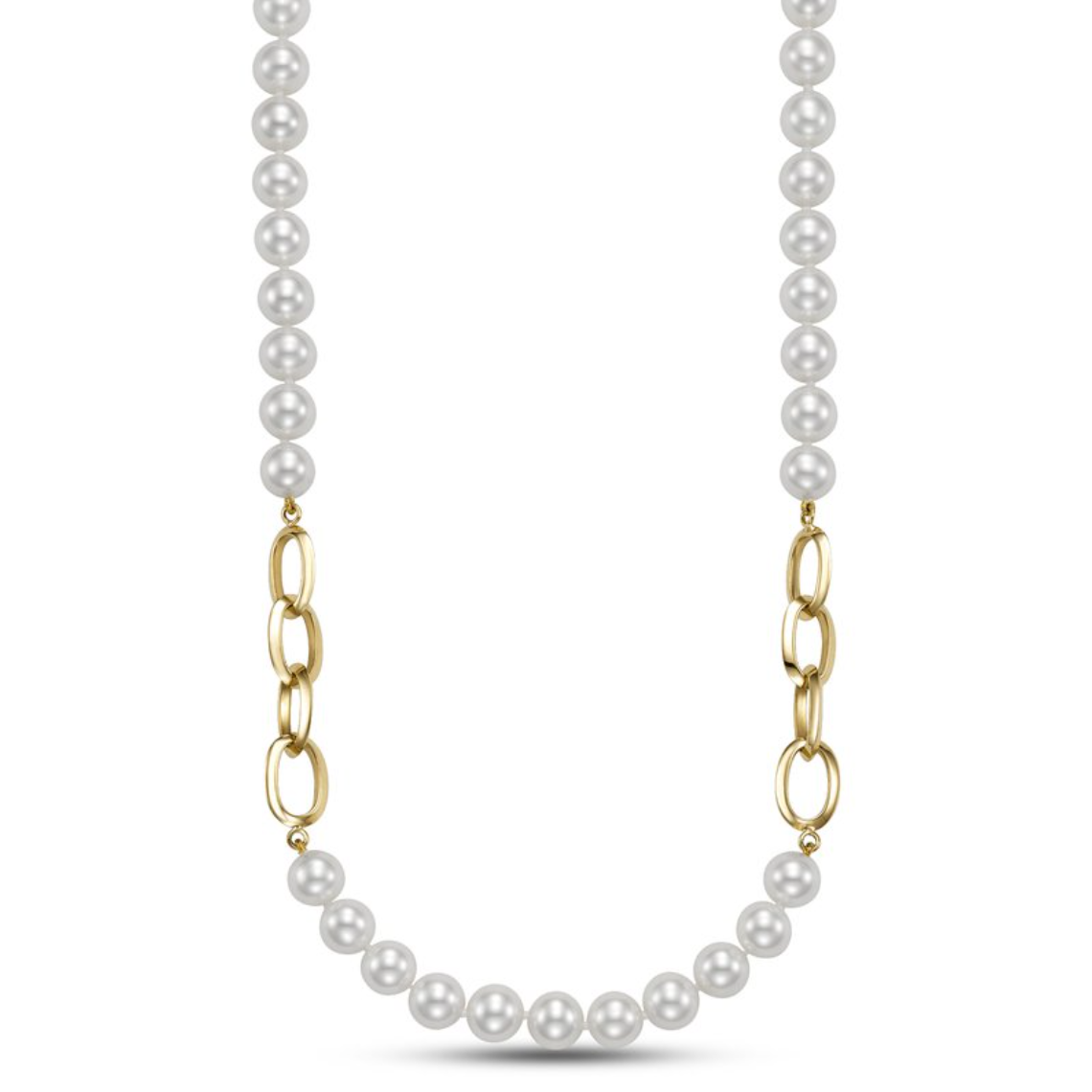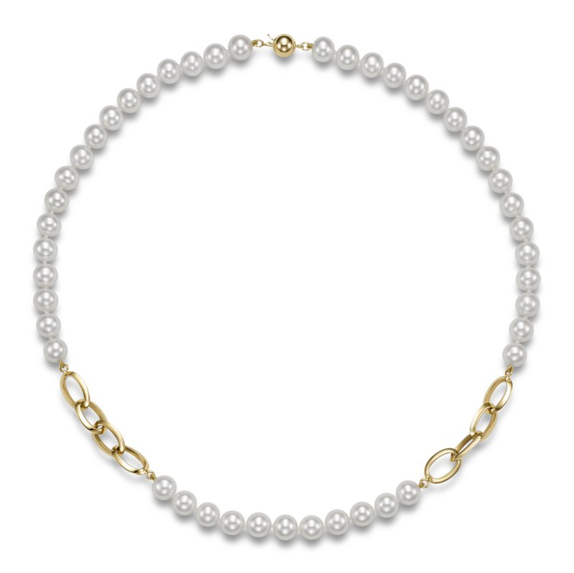 A Mastoloni pearl necklace with chain link details, set in 14K yellow gold.