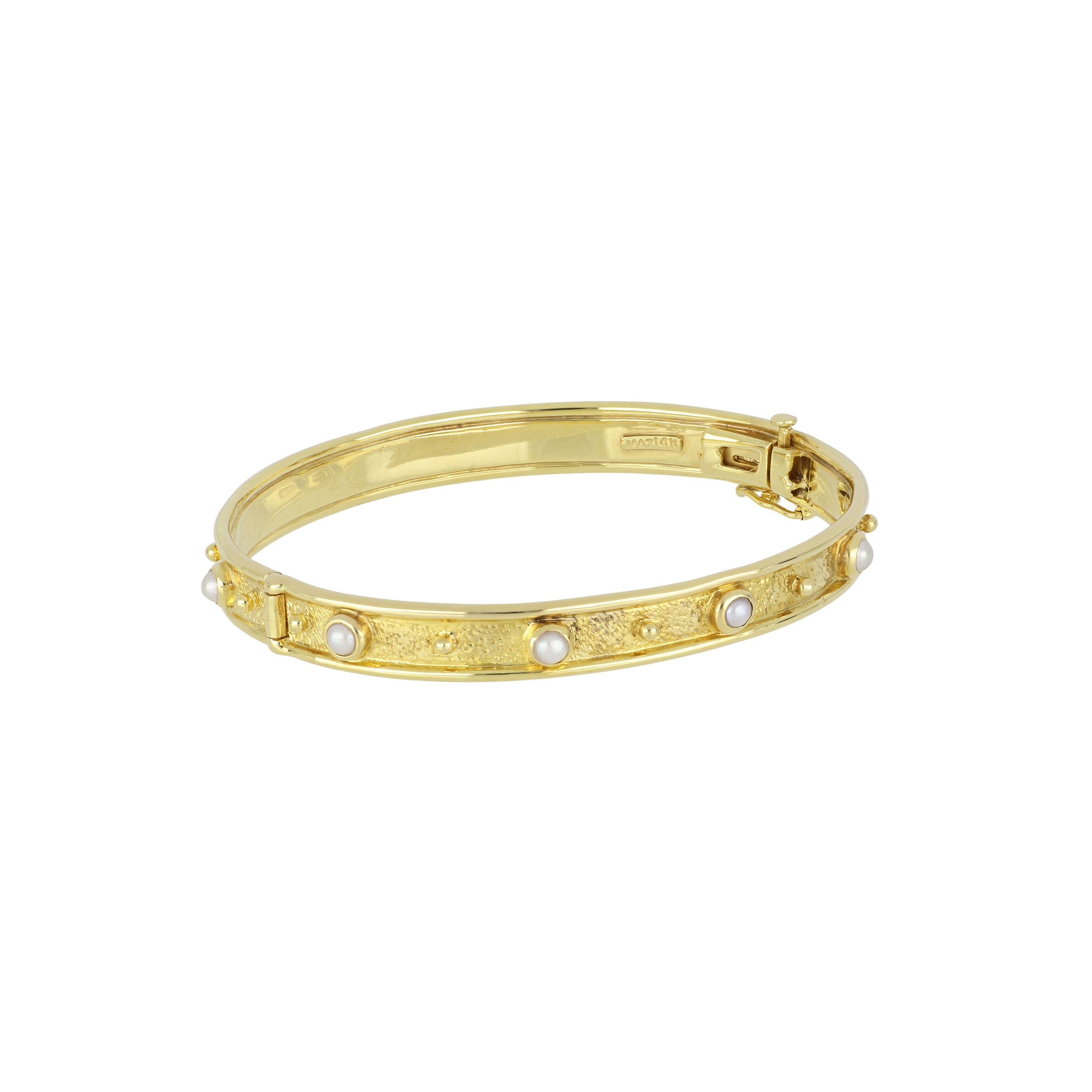 A Mazza pearl hinged bangle bracelet with a hammered finish, in 14K yellow gold.Official RetailerSize: 6.50 inches