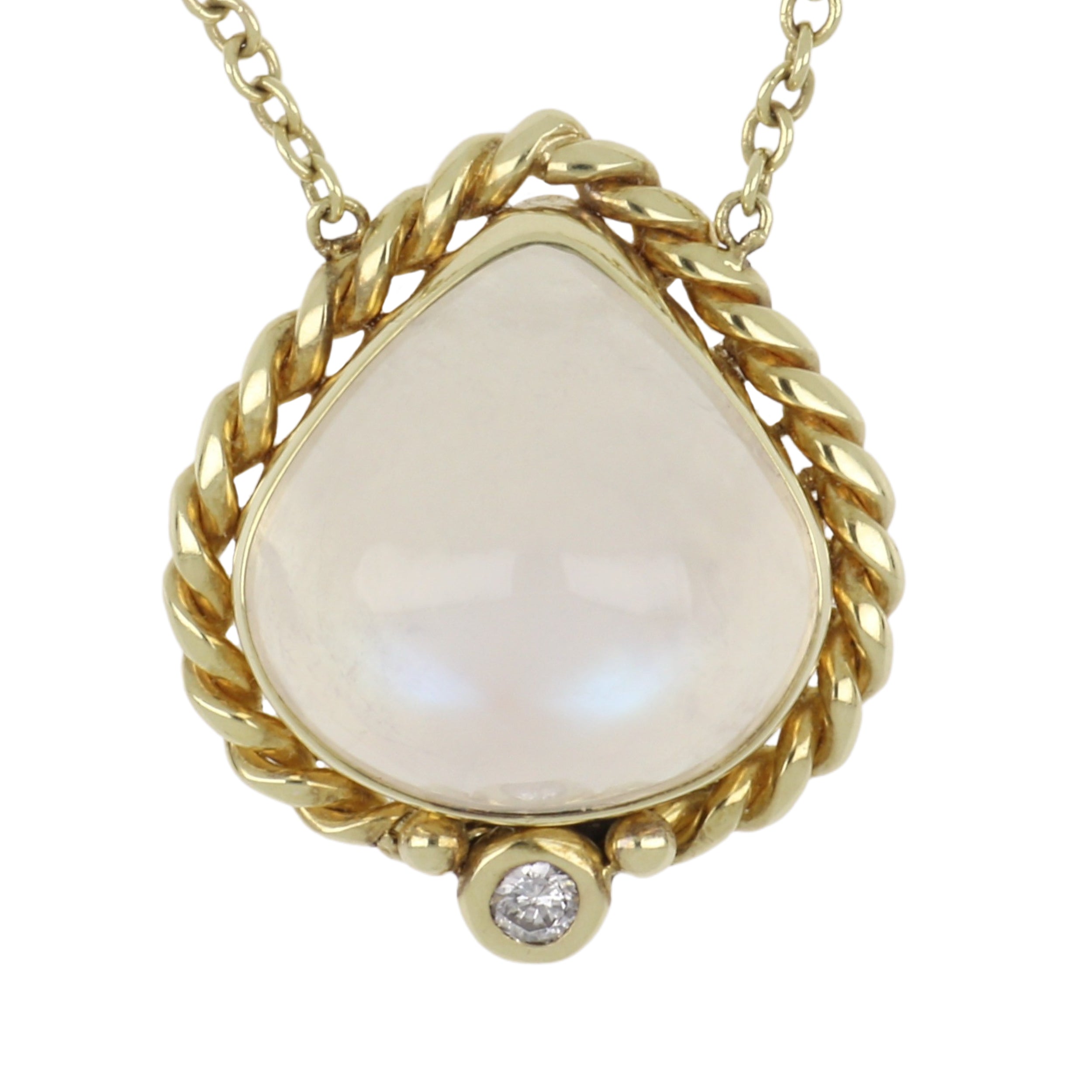 A Mazza bezel-set cabochon moonstone rope border pendant necklace with a round brilliant-cut diamond, set in 14K yellow gold.
