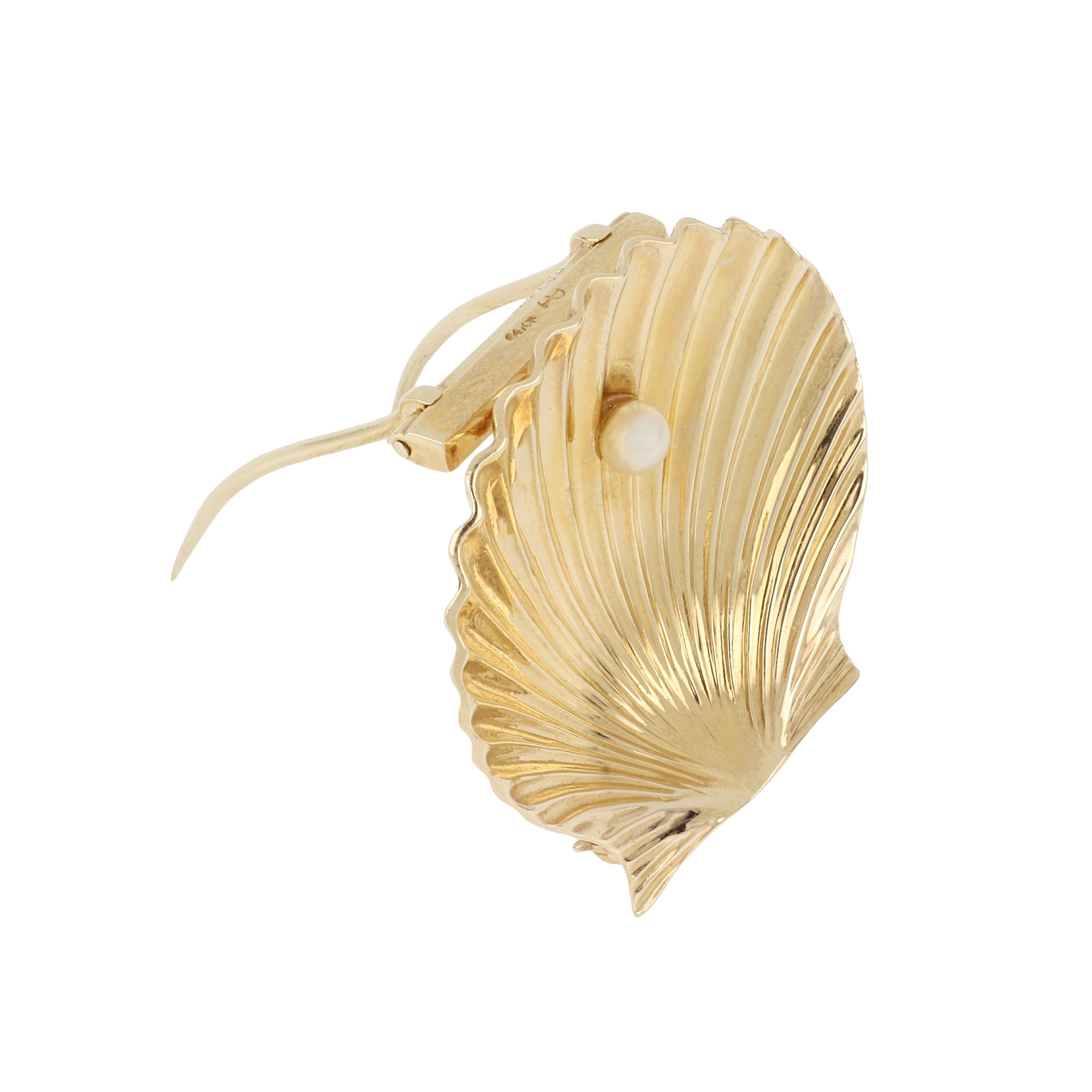 A Retro Cartier 14K yellow gold shell brooch with a single pearl. Circa 1940.