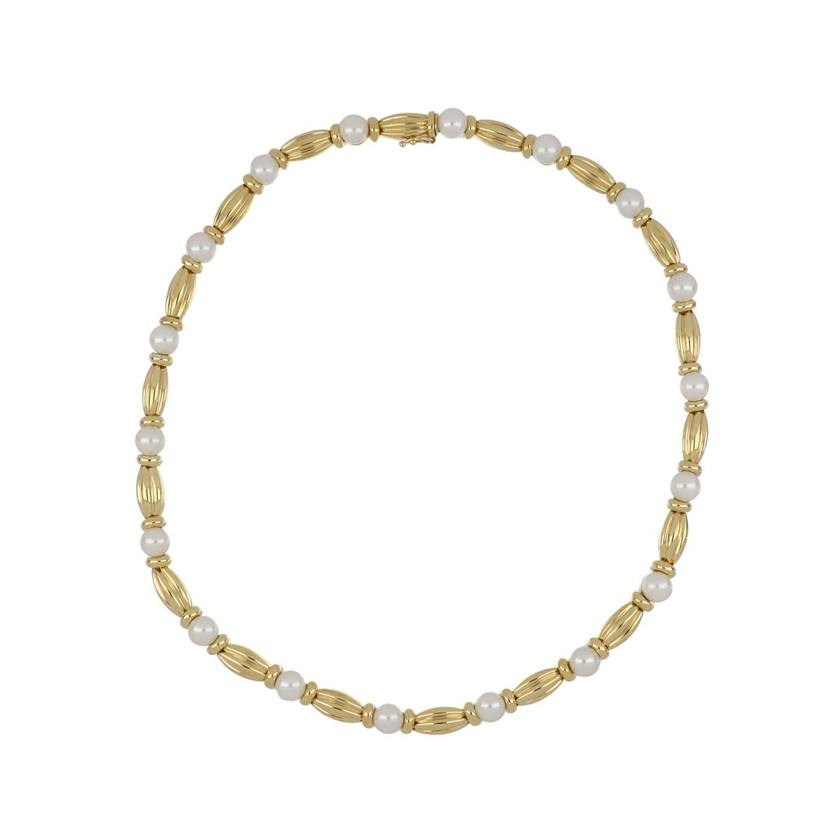An estate vintage, Tiffany & Co. choker necklace with numerous round cultured pearl stations, set in 18k yellow gold.
