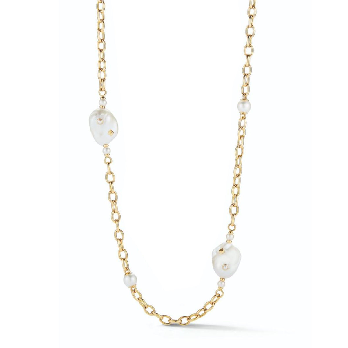 A Trianon Lisbon outside chain necklace with pearl accents, and baroque pearls studded with yellow gold pyramids, in 18K yellow gold.